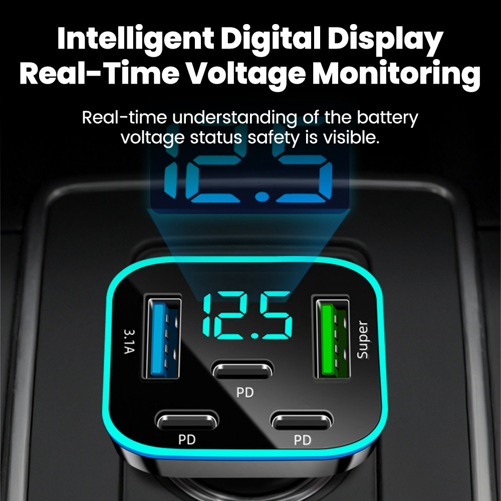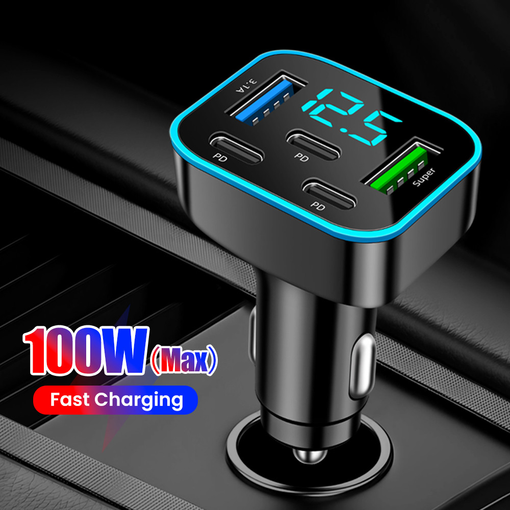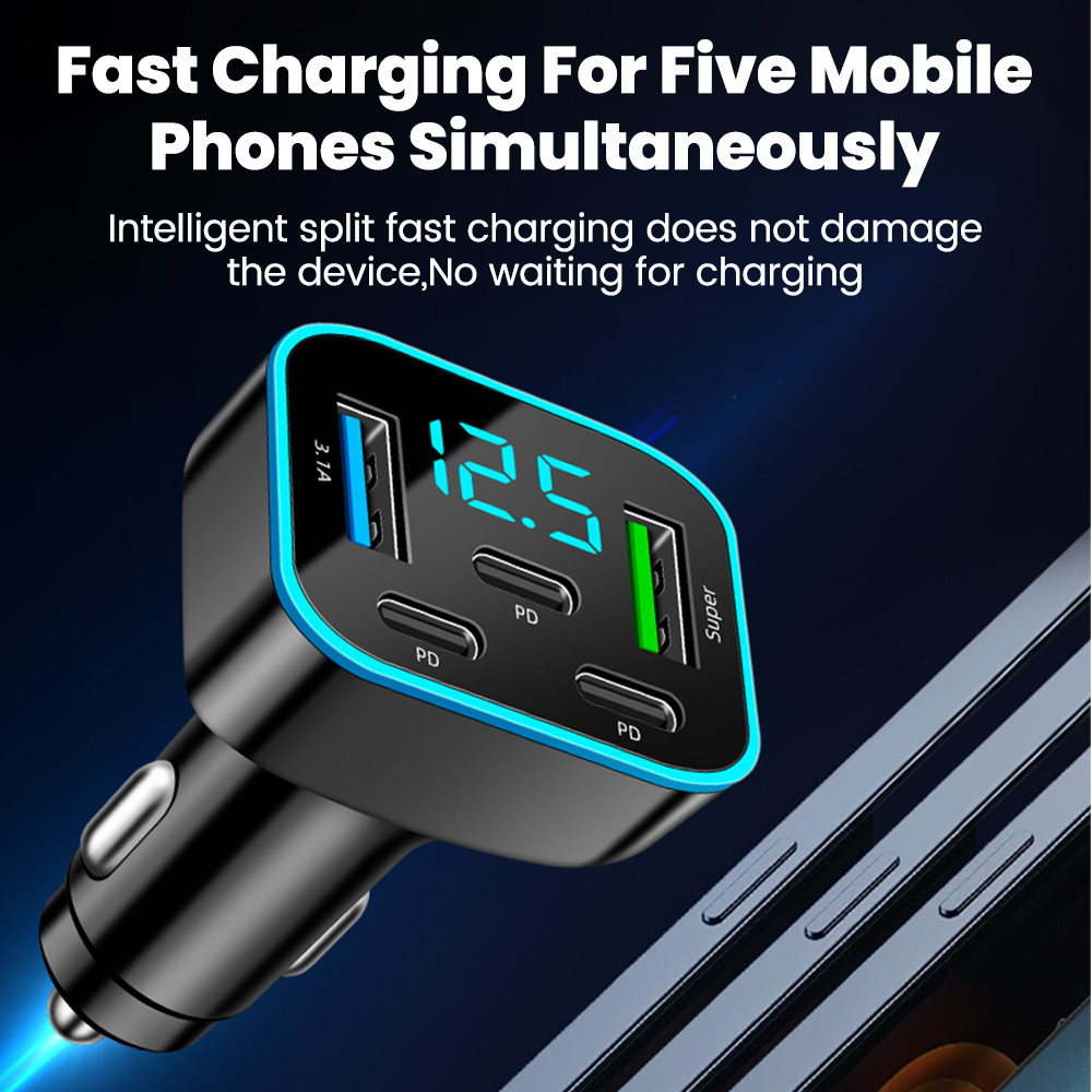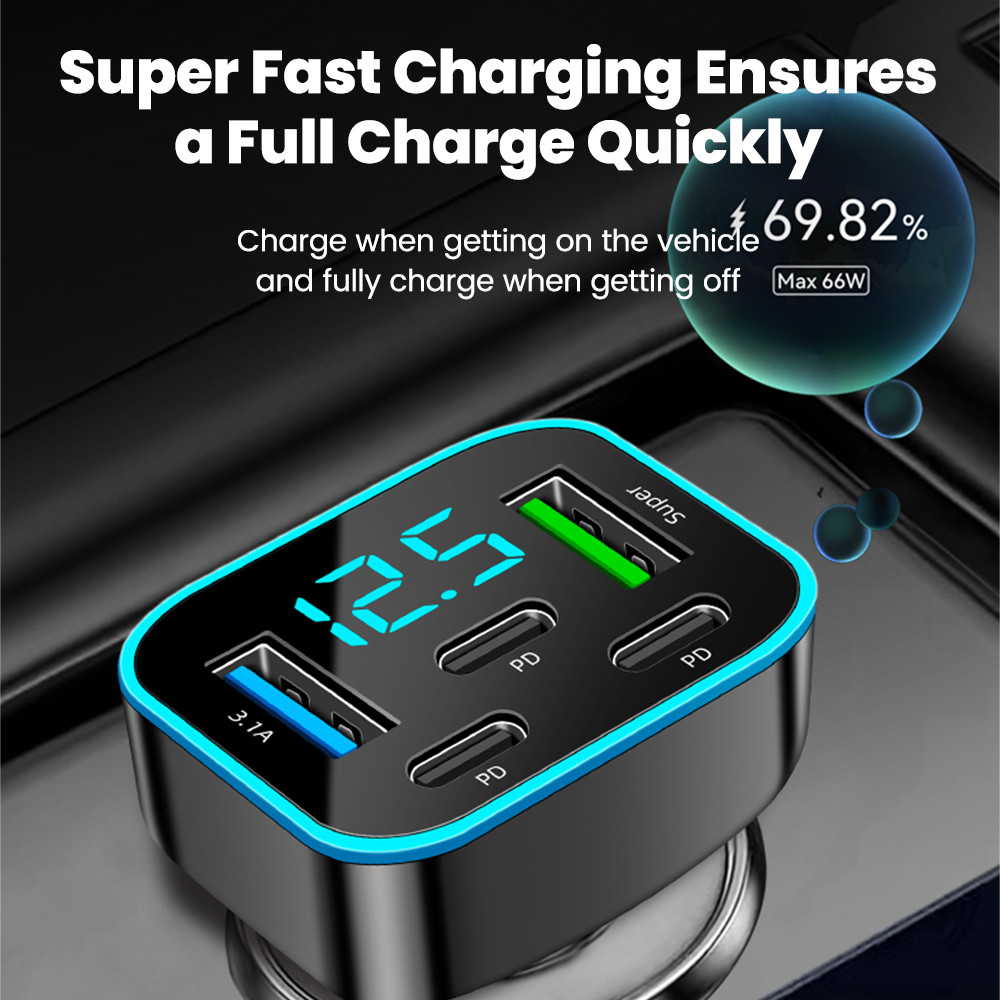 ที่ชาร์จในรถยนต์แบบ 5 พอร์ต 66W ชาร์จเร็ว 2USB 3Type C PD QC3.0 อะแดปเตอร์ชาร์จโทรศัพท์ในรถ