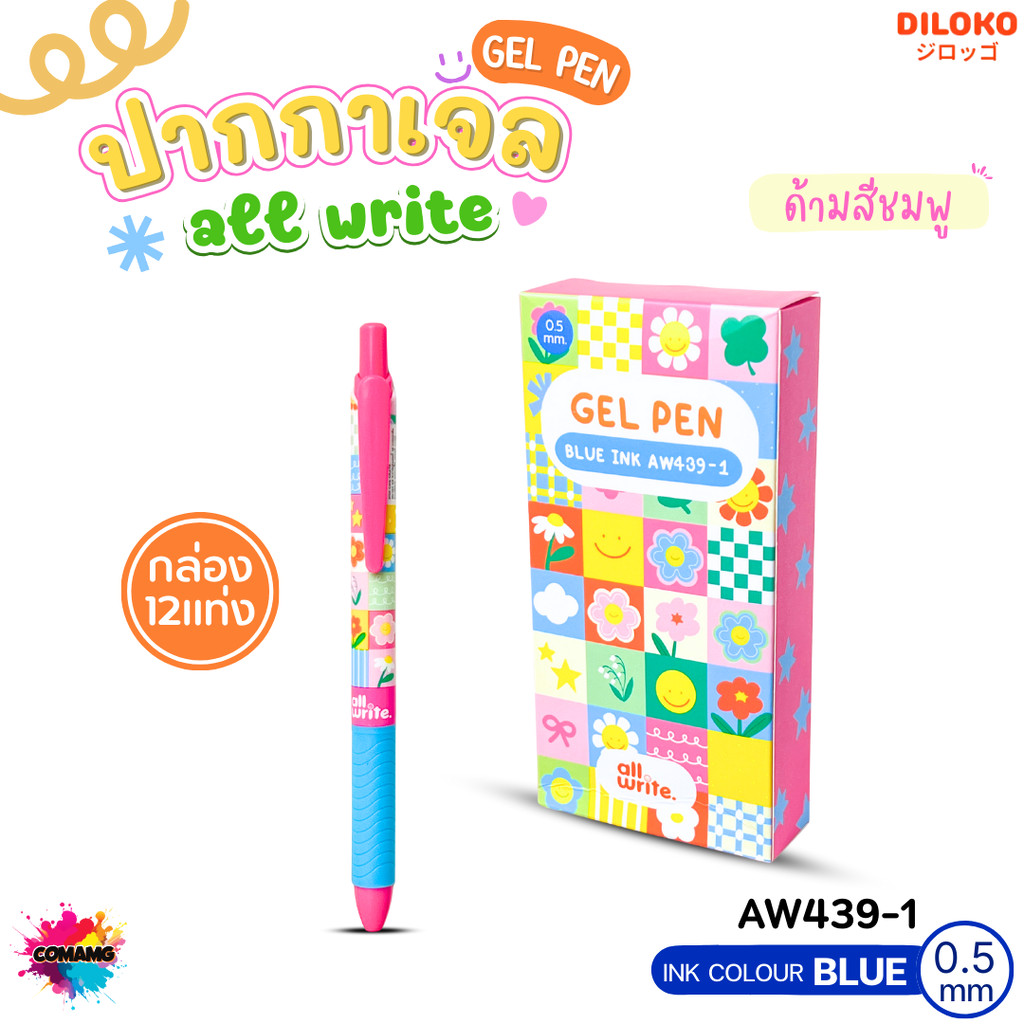 (ยกกล่อง 12แท่ง) Allwrite ปากกาเจล ลายดอกไม้ หัว0.5MM หมึกน้ำเงิน เขียนลื่น แห้งไว พร้อมส่ง