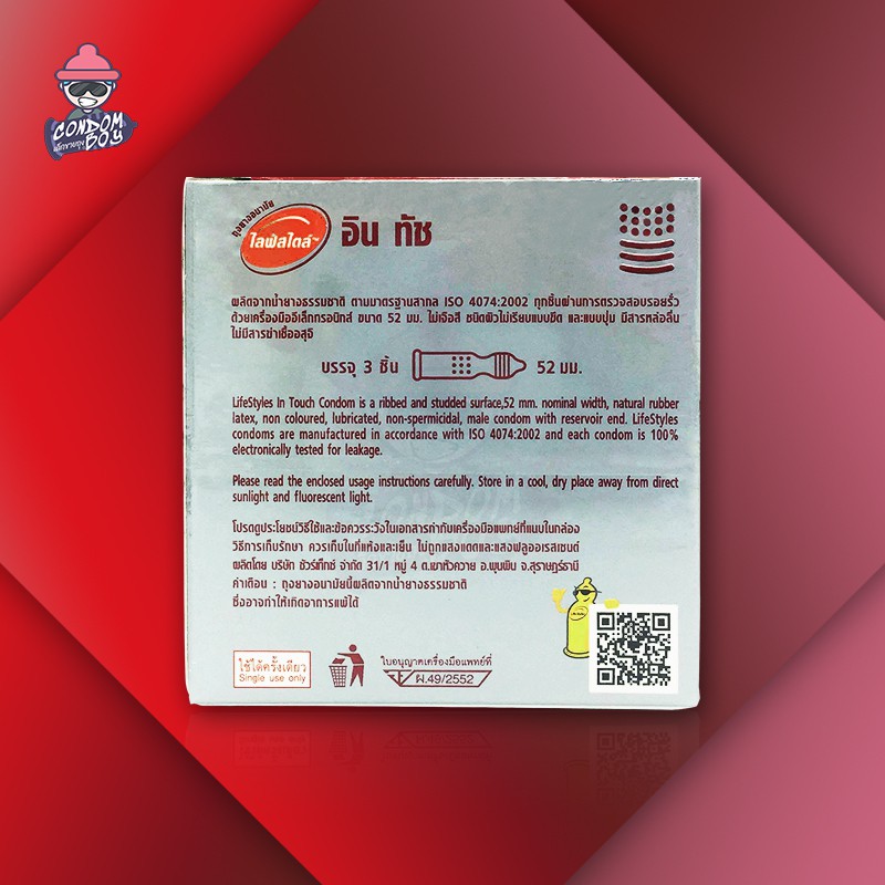 LifeStyles in Touch ถุงยางอนามัย ไลฟ์สไตล์ อิน ทัช ผิวไม่เรียบ ขรุขระ แบบมีปุ่มและวงแหวน ขนาด 52 mm. (1 กล่อง)