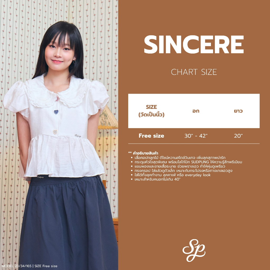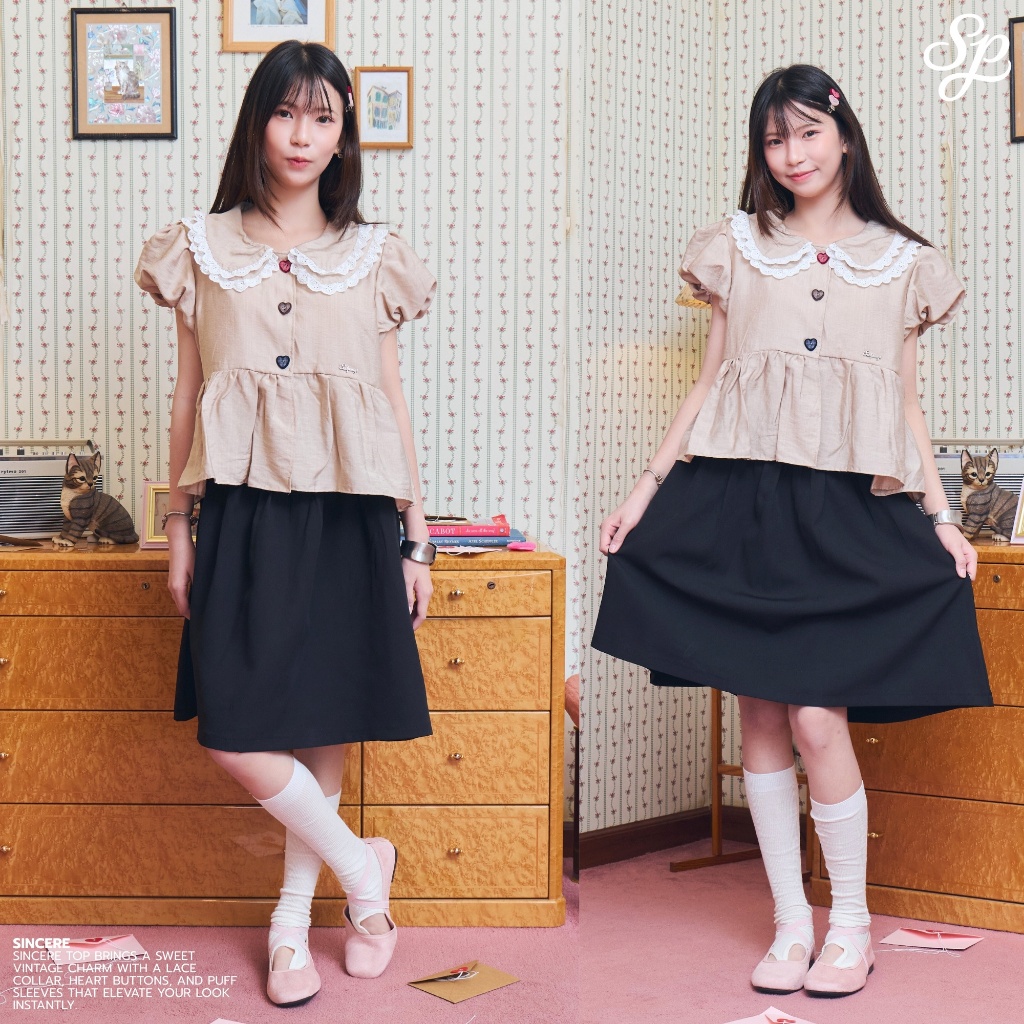 Sincere_SP115 เสื้อคอบัวแขนตุ๊กตา กระดุมหัวใจ ดีเทลลูกไม้ 2 ชั้น น่ารักมาก มีโลโก้เหล็กสุดปัง