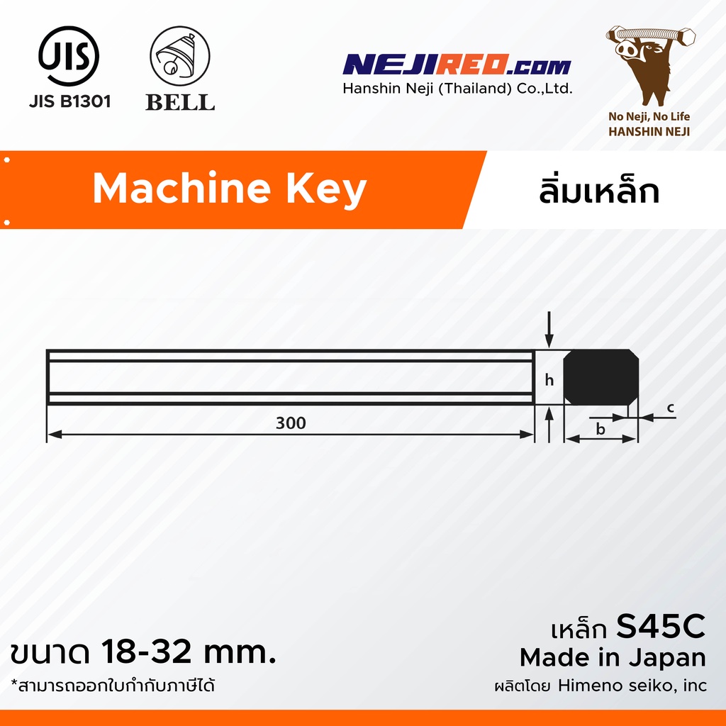 ลิ่มแท่งเหล็ก S45C Machine key / Parallel Key ยาว 300 มิล ยี่ห้อ Bell (ขนาดตั้งแต่ 18-32 mm.)