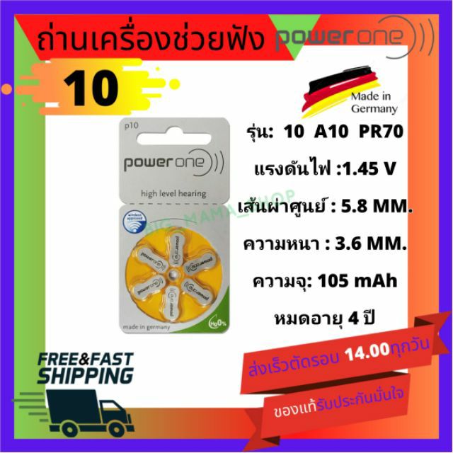 ถ่านเครื่องช่วยฟัง เบอร์10 สีเหลือง PowerOne A10 PR70 HearingAidBatteries ถ่านใส่เครื่องช่วยฟังแท้