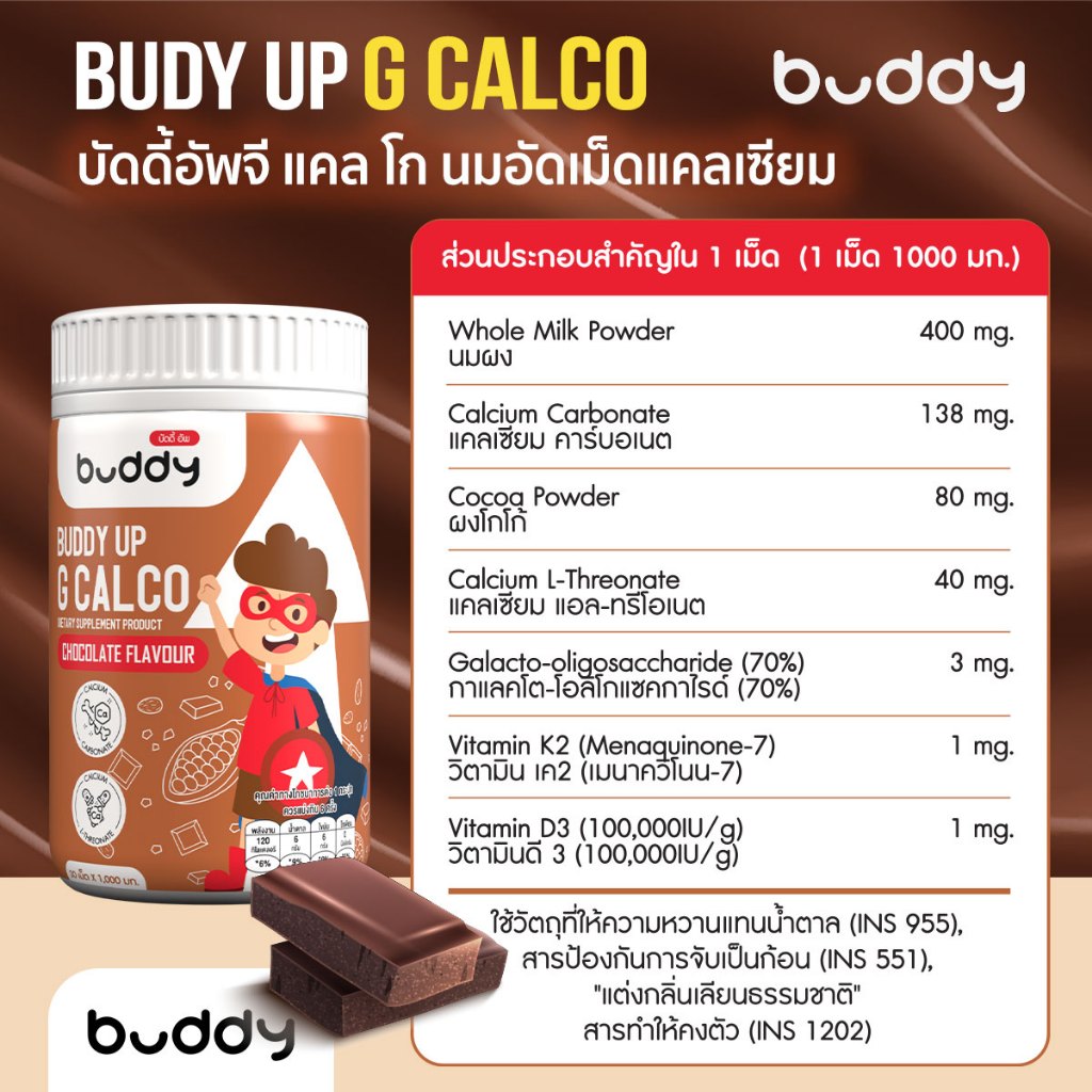 [1ฟรี1]บัดดี้ อัพ G Calco นมอัดเม็ดช๊อกโกแลต เสริมแคลเซียม + D3+ K2 สูตรสูง บำรุงกระดูกและฟัน ส่งด่วนฟรี
