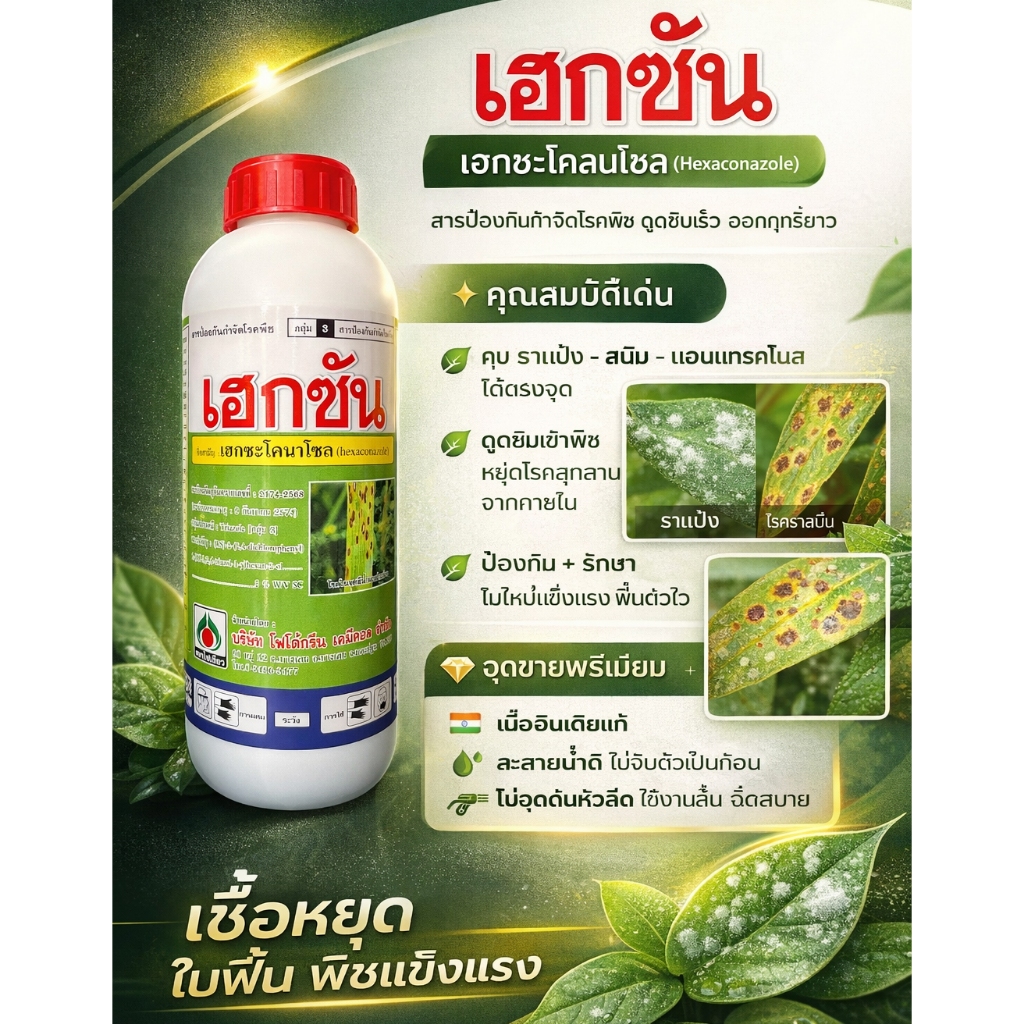 เฮกซัน เฮกซะโคนาโซล ( 1 ลิตร ) ใช้ป้องกันกำจัดโรคพืชได้กว้างขวาง ใบไหม้ เมล็ดด่าง ใบจุด แอนแทรคโนส