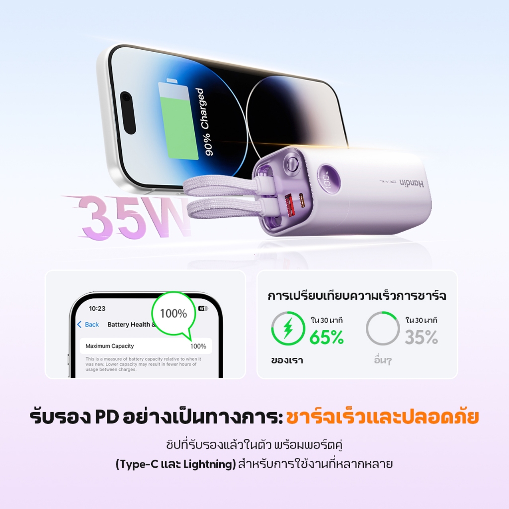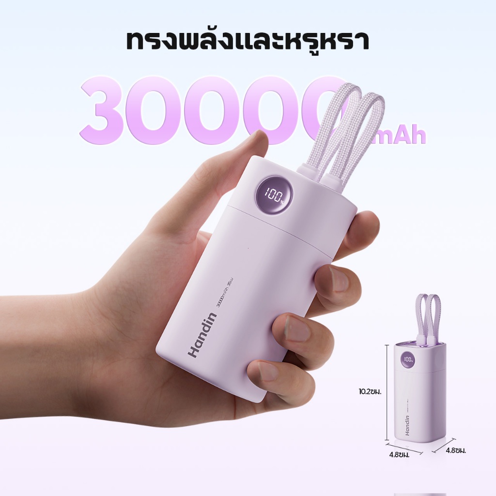 [China CCC]Handin PD35W Power Bank 30000mAh ชาร์จเร็ว แบตเตอรี่สำรอง มีหน้าจอ LED สายชาร์จในตัว 2 เส้น รับประกัน 2 ปี