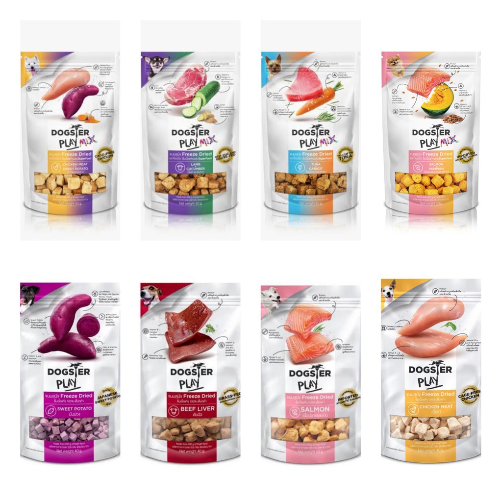 ขนมสุนัข Freeze Dried Dogster Play ขนาด 40 กรัม 1ซอง ( มี 8 สูตรให้เลือก ) ชิ้นเนื้อแท้ 100% เต็มๆคำ