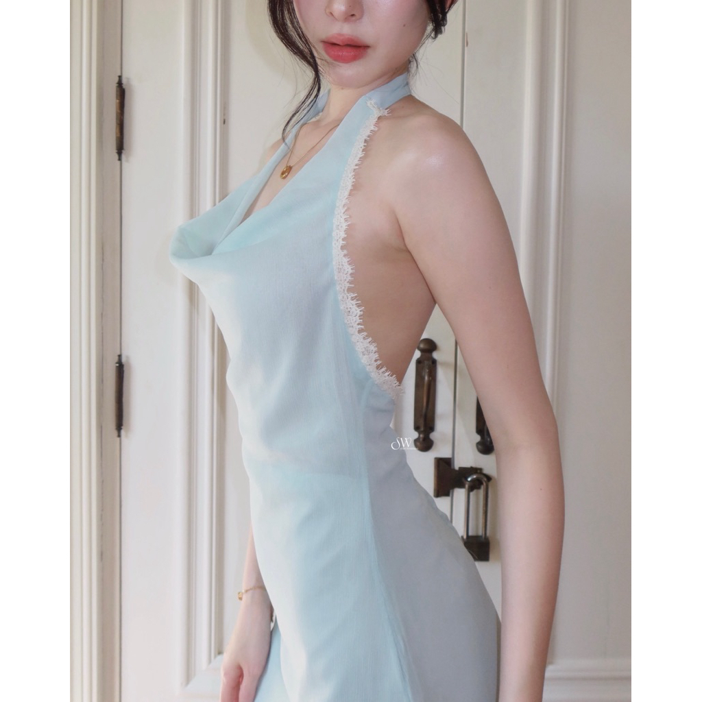 เดรสผ้าชีฟองคล้องคอพริ้วๆ ดีเทลตัดต่อชายกระโปรงลูกไม้