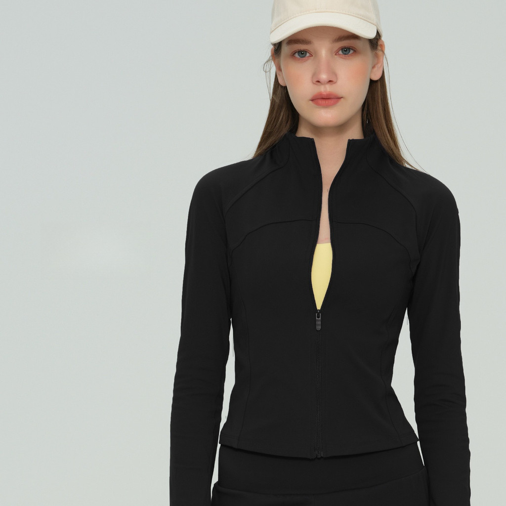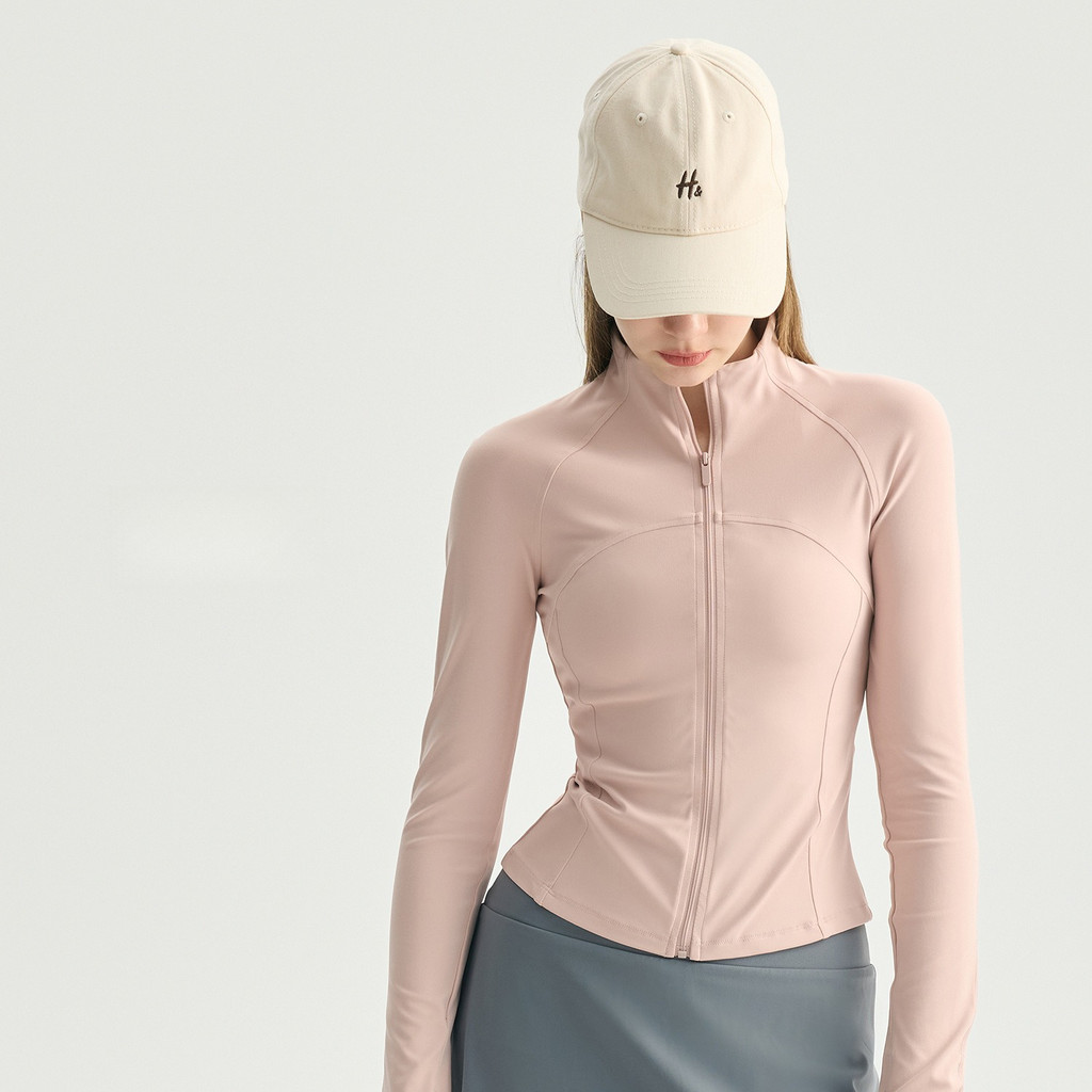 OALA Stand Collar Zipper Finger Sleeve เอว-Cinching สั้นฟิตเนสวิ่งการฝึกอบรมโยคะพิลาทิสเสื้อกีฬาด้านบน