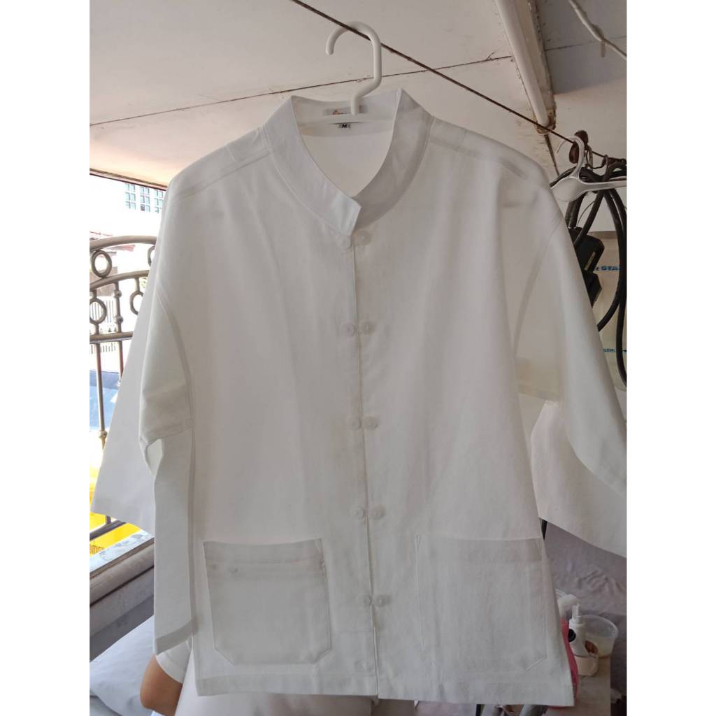 เสื้อคอจีนกระดุมคู่ลูกปัดหลัง มีกระเป๋าล่าง 2 ใบ ชุดขาวปฏิบัติธรรมผ้าฝ้ายแท้ ใส่สบาย ไม่ร้อน
