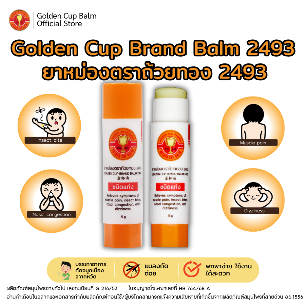 GoldenCup Brand Balm 2493 | ยาหม่องตราถ้วยทอง 2493 ชนิดแท่ง 1 กล่อง (6 หลอด)