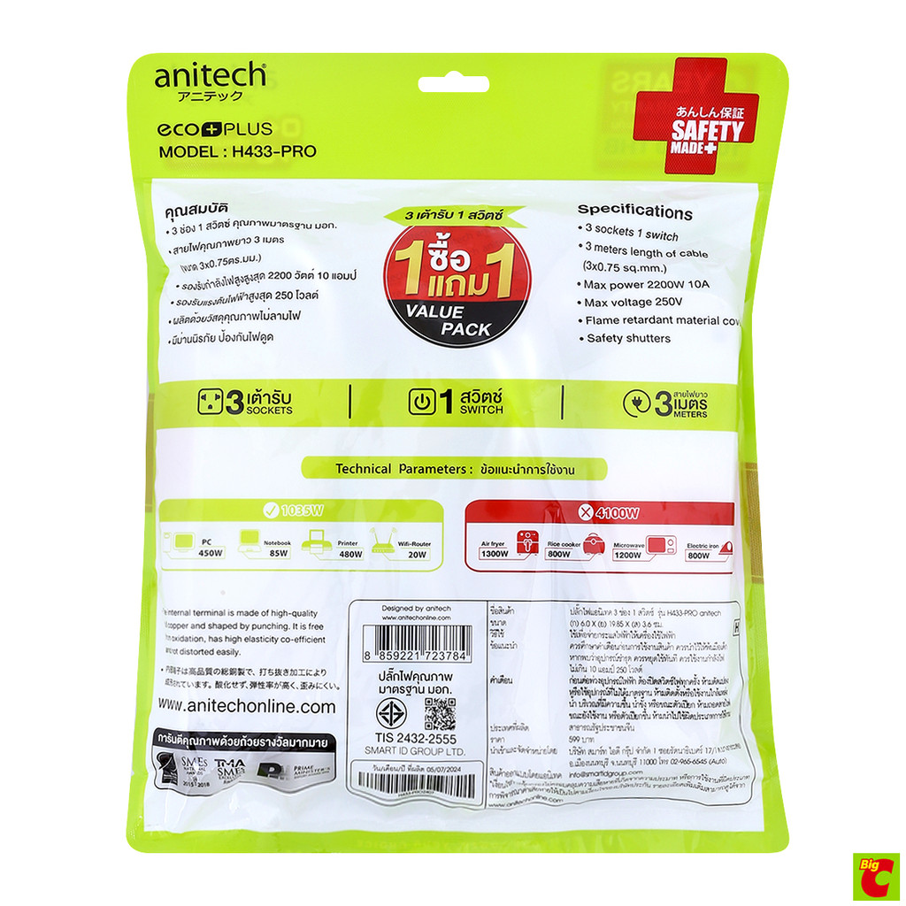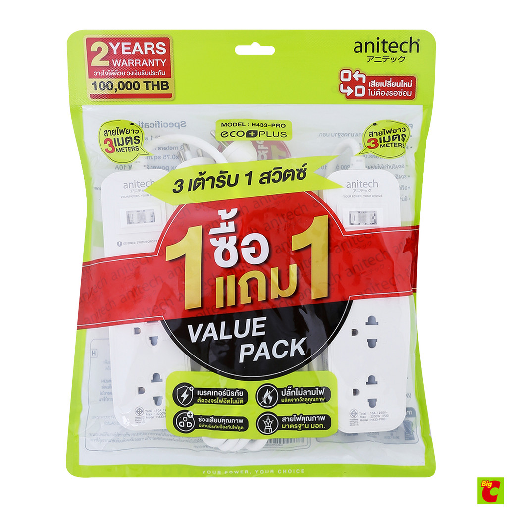 แอนิเทค ปลั๊กไฟ 3 ช่อง 1 สวิตช์ รุ่น H433-PRO