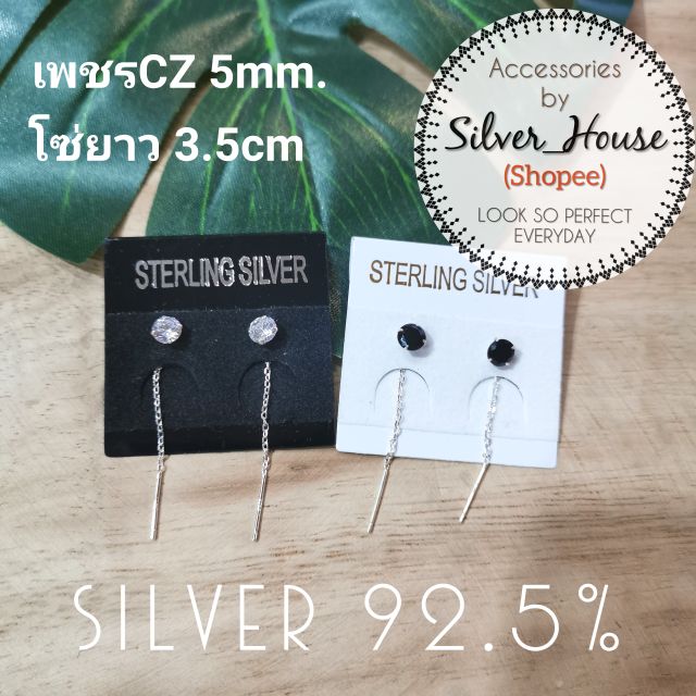 ต่างหูเงินแท้ 92.5% แบบโซ่คล้อง หัวเพชรCZ 5mm.