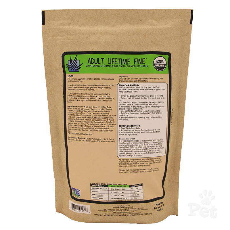 อาหารนกแฮริสัน HARRISON ADULT LIFETIME FINE 454 กรัม