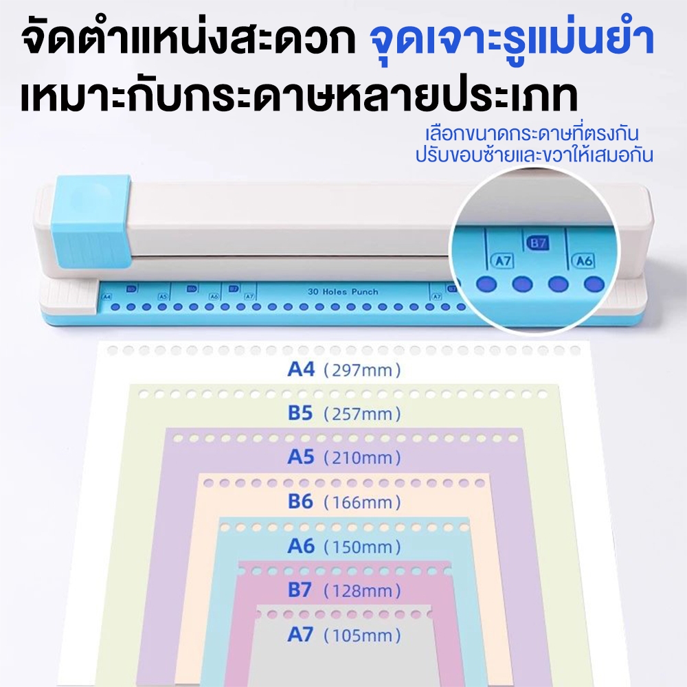 【แถมฟรี แถบสันปก 10 อัน】เครื่องเจาะรูกระดาษ แบบพลาสติก 30 รู เหมาะกับกระดาษหลายประเภท ไดอารี่ สมุดภาพ 5 แผ่น