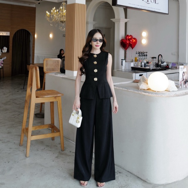 HILOOK ชุดเชต เสื้อแขนกุดคอกลม แต่งกระดุมทอง ดีเทลดูสวยหรูแพงมีซับใน+ กางเกงขายาวกระบอบทรงสวย