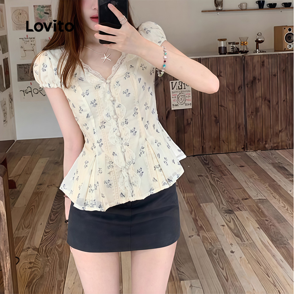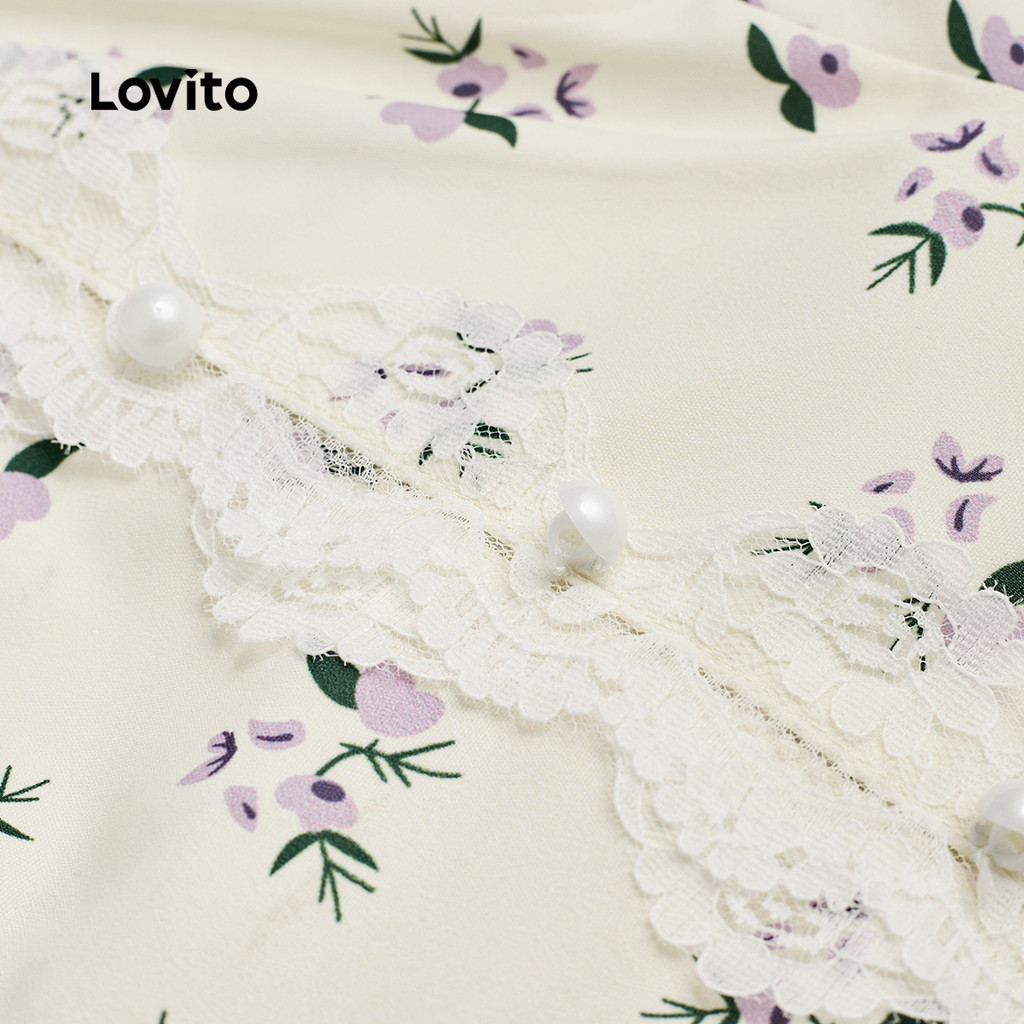 Lovito เสื้อเชิ้ตผู้หญิง ลายลูกไม้ มีกระดุมหน้า ผ่าข้าง สําหรับฤดูใบไม้ผลิ ฤดูร้อน L154ED1015