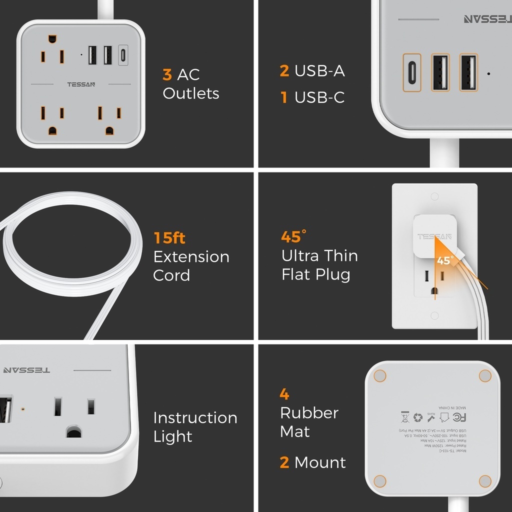 TESSAN สายต่อพ่วงพร้อมพอร์ต USB และ Type C ปลั๊กแบน รางปลั๊กไฟแบบพกพา คุณภาพสูง