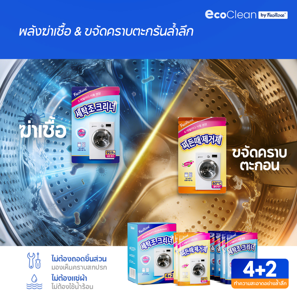 EcoClean ผงล้างเครื่องซักผ้า 2สูตร ฆ่าเชื้อ99.999% ขจัดเชื้อรา สลายตะกรัน ถังซักผ้าสะอาดเหมือนใหม่ ลดกลิ่นอับทันที ไม่ต้องแช่