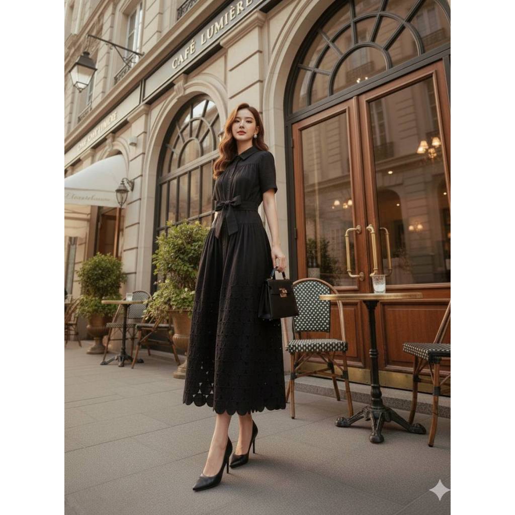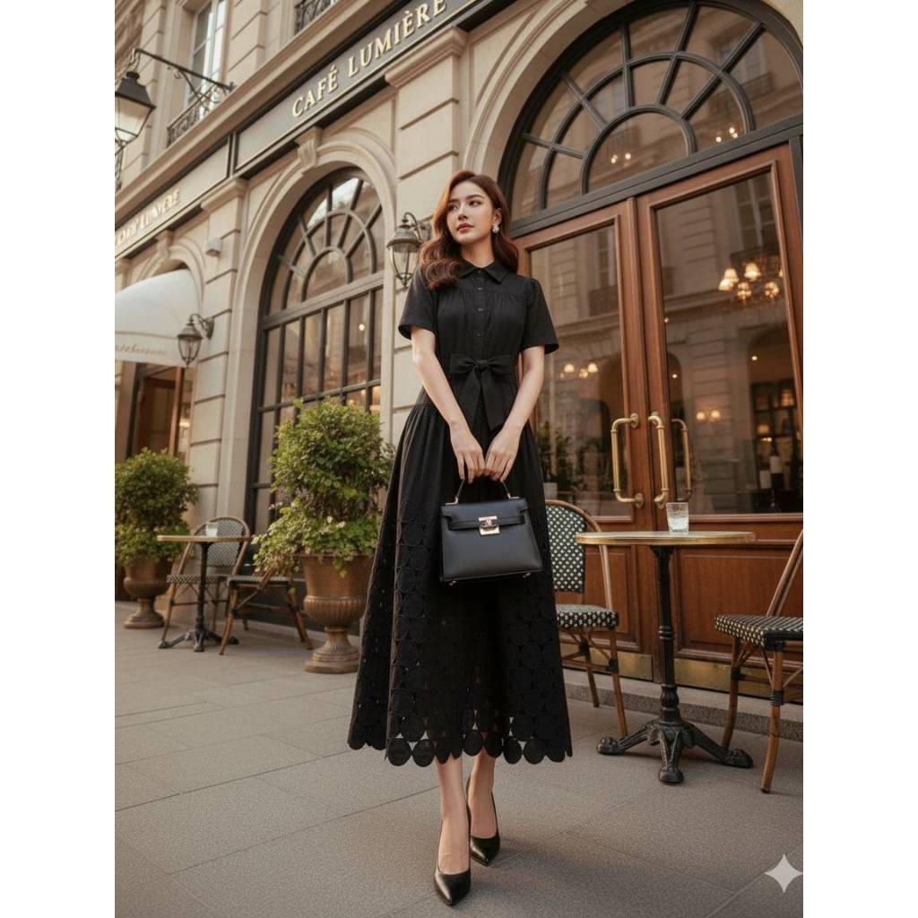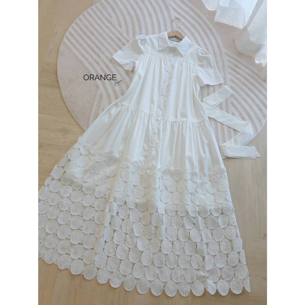 OR99143 เดรสยาวทรงเอ ผ้าฝ้ายคอปกแต่งชายลูกไม้ ทรง Over size พร้อมผ้าผูกเอว