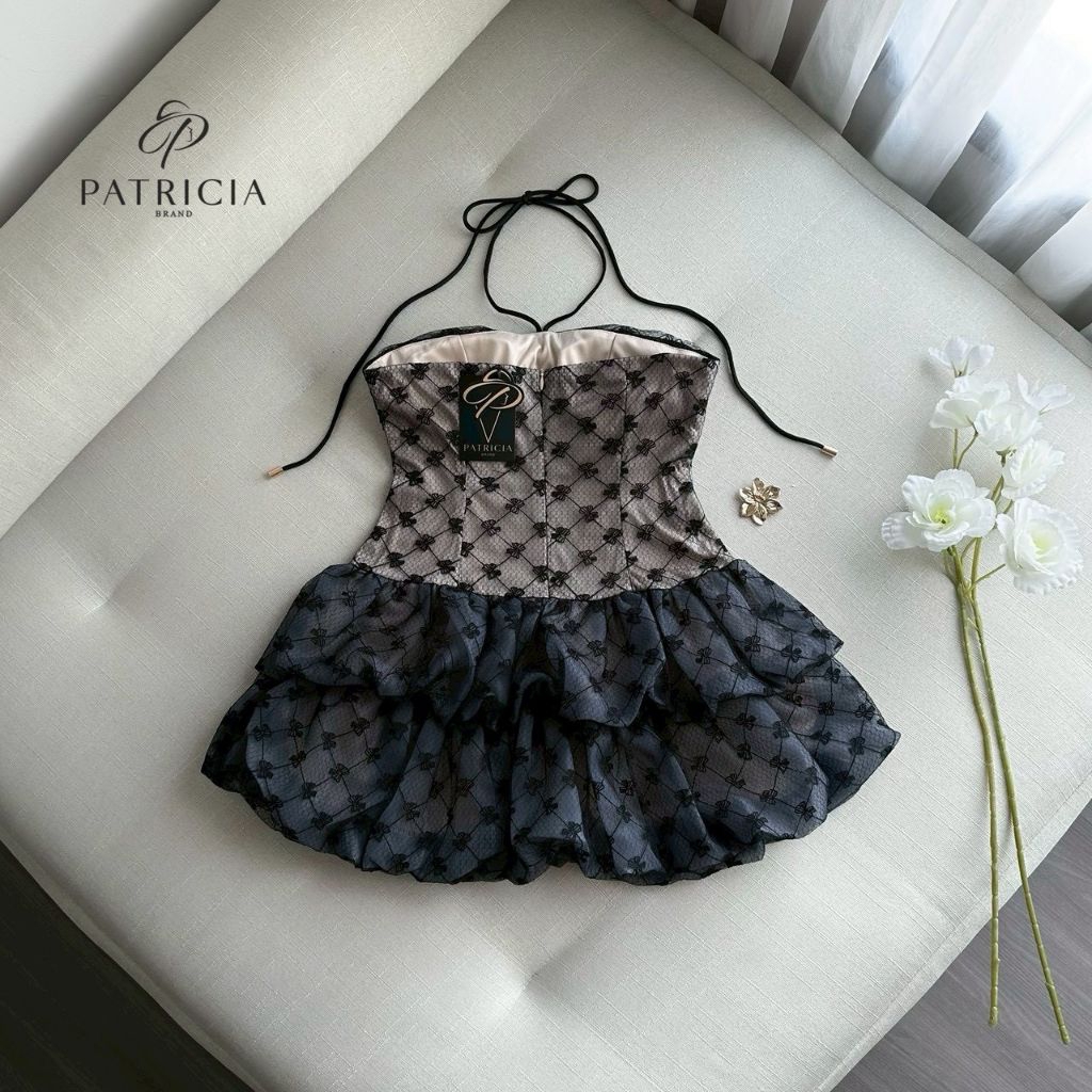 เดรสปาร์ตี้สีดำเซ็กซี่ ผ้าลูกไม้เนื้อดีมีลวดลาย มีดีไซน์ตัดเย็บจับจีบตรงหน้าอกและเว้าตรงกลางอก มีเข็มกลัดดอกไม้สีทอง