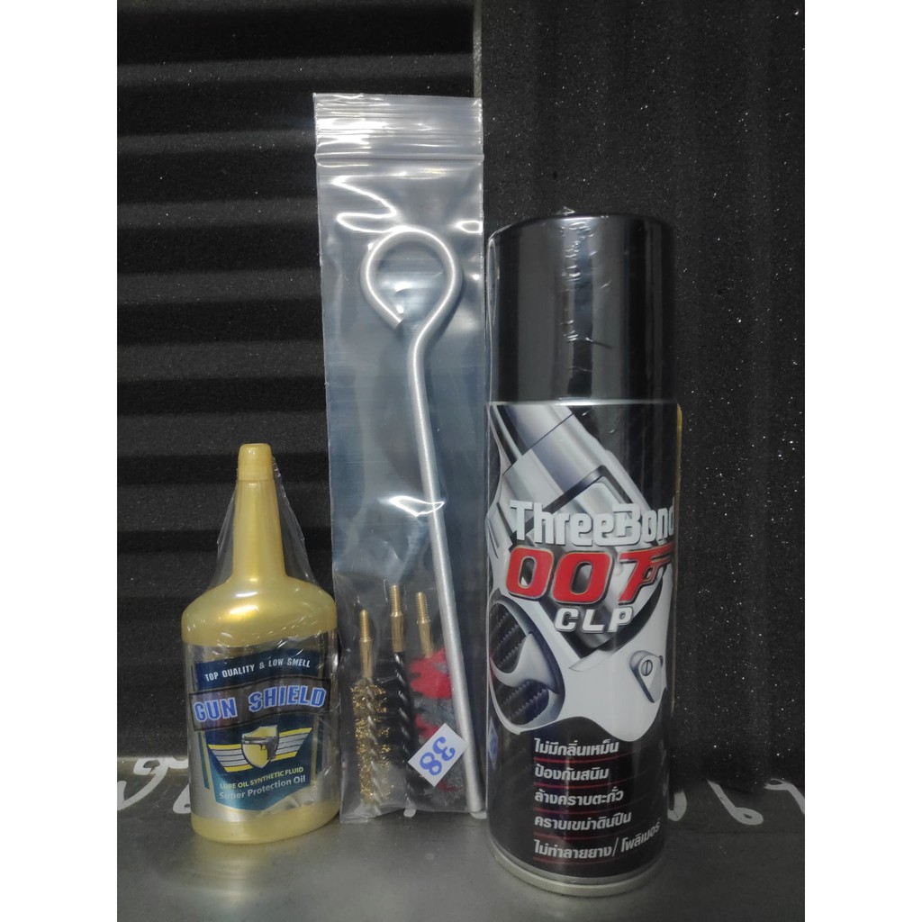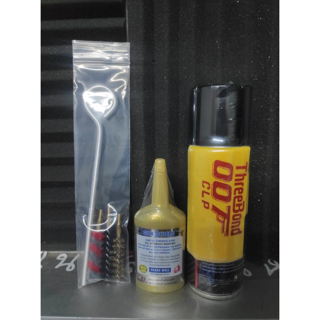 แพ็คสุดคุ้มน้ำยาล้างปืนยี่ห้อTHREEBOND007ขนาด200MLแถมผ้าเช็ดในตัว/น้ำมันชโลมปืนGUNSHIELDและแส้ล้างปืน9mm.38.380.32