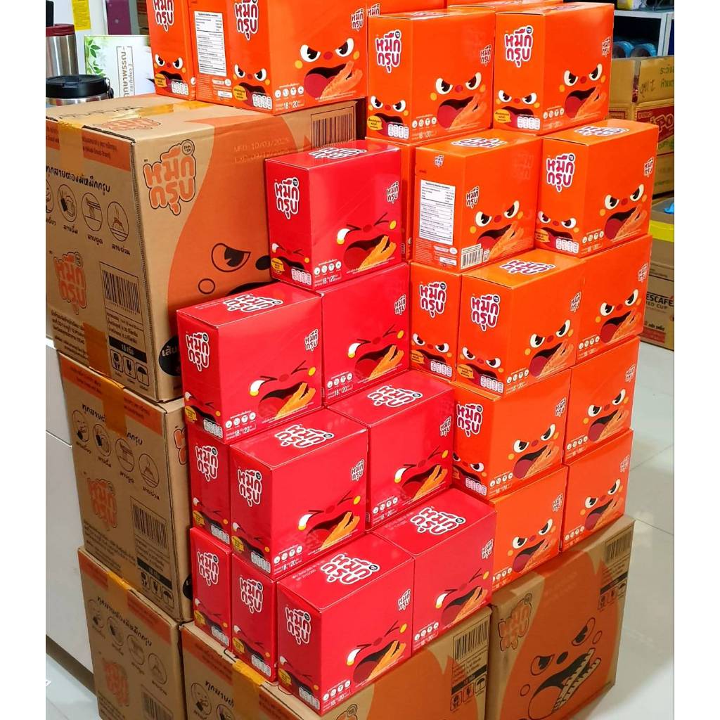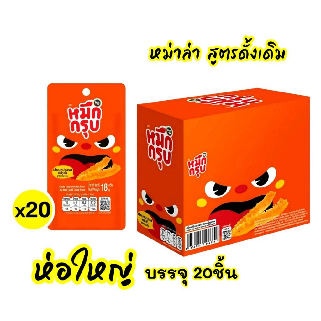 hot! หมึกกรุบ รสหม่าล่า แบบกล่อง 20ชิ้นx18กรัม(360กรัม) สูตรดั้งเดิม(สีส้ม)+สูตรเผ็ด(สีแดง)