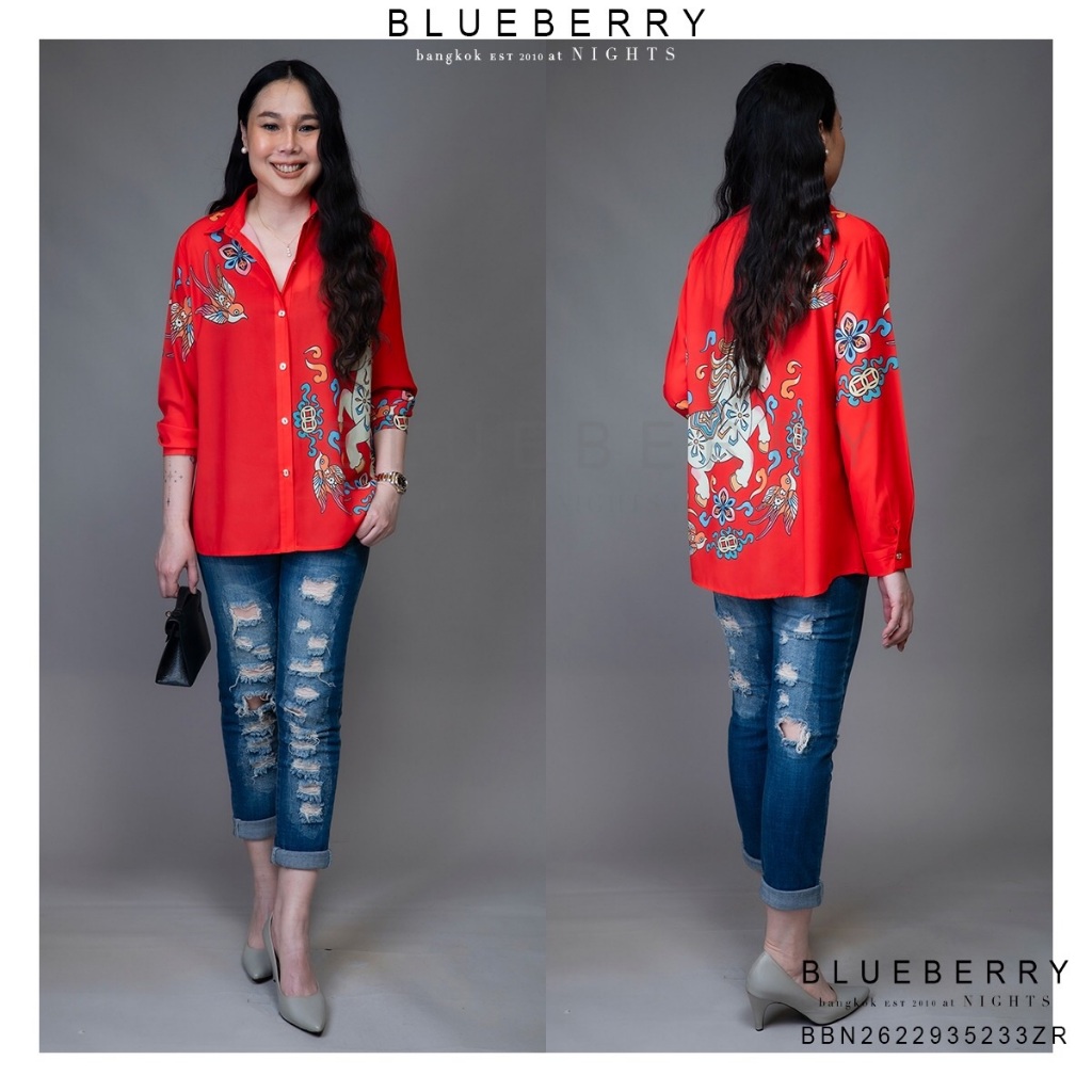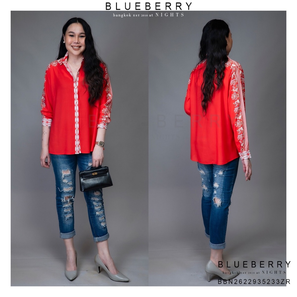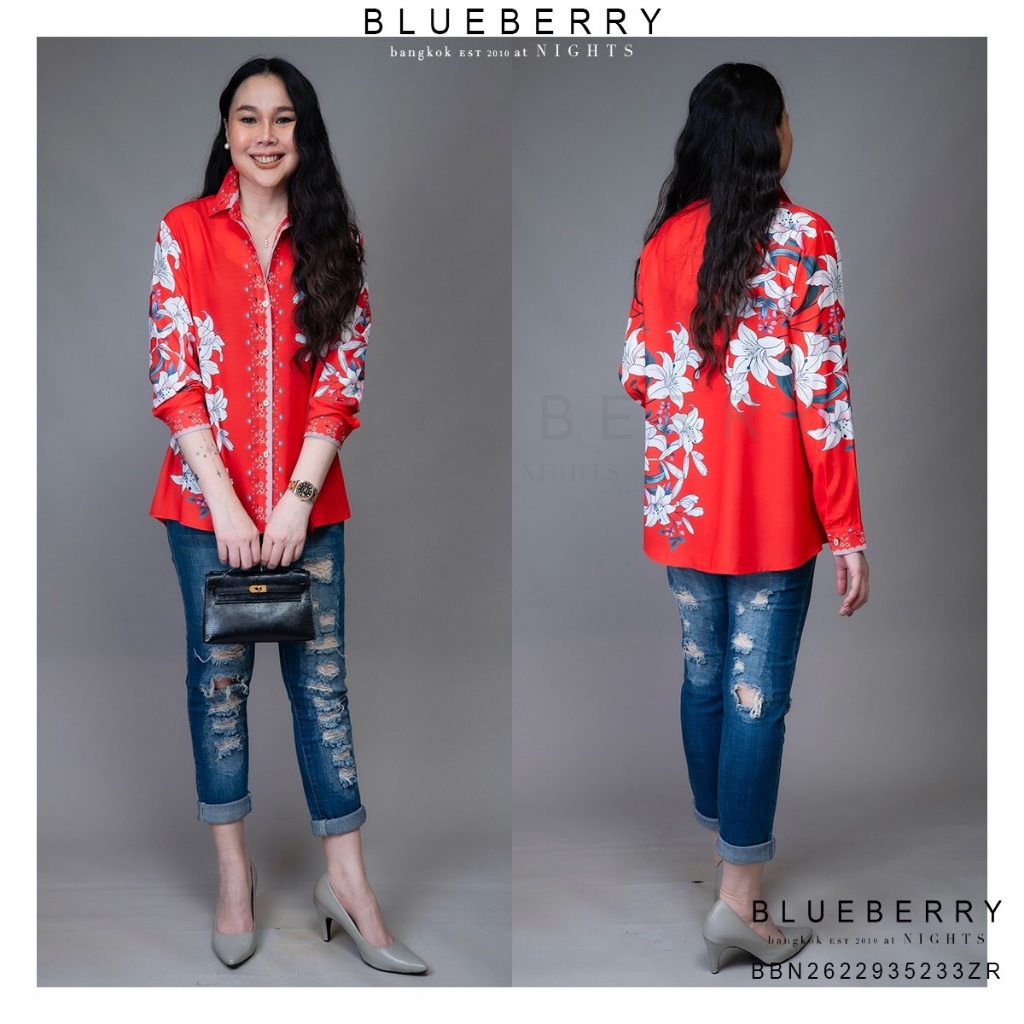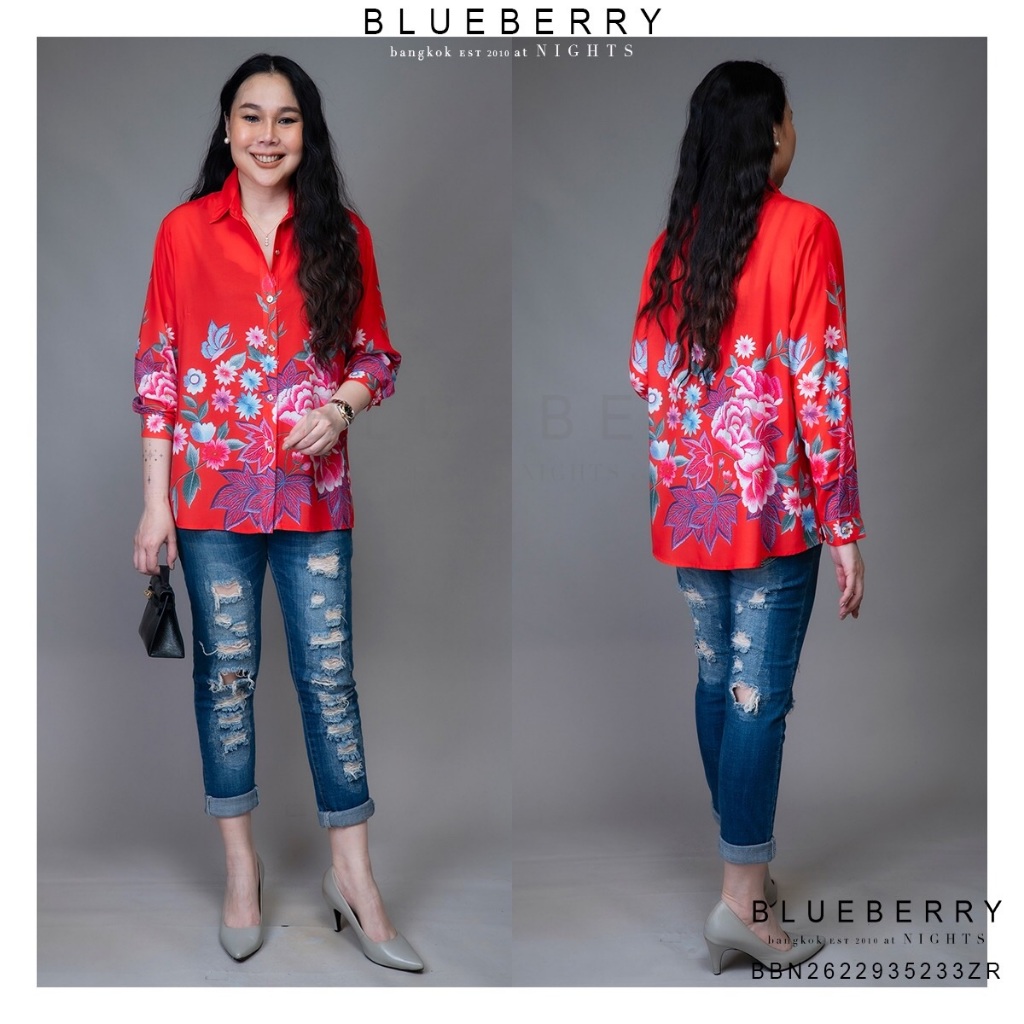 (อก44) B4363 BLUEBERRY NIGHTS เสื้อเชิ้ตแขนยาว ผ้าโพลีเอสเตอร์ผสมชีฟองพิมพ์ลายทั้งตัว ปลายแขนเชิ้ตติดกระดุม