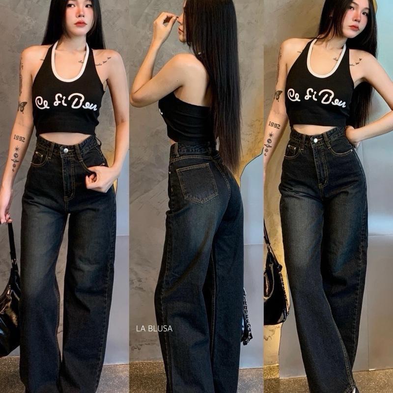 กางเกงยีนส์ขายาวทรงกระบอกกลางเอวสูง