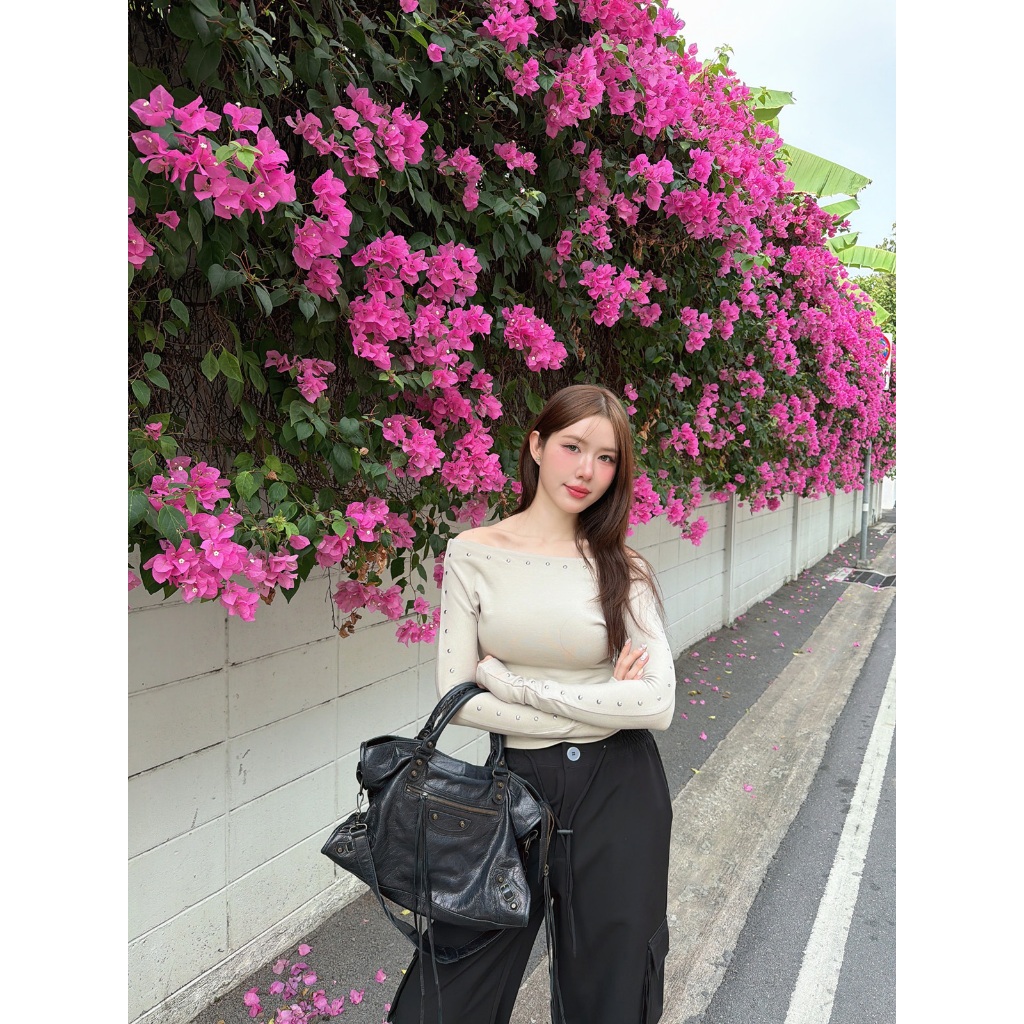ส่งด่วน🚨 SLYQ STUDDED OFF SHOULDER JERSEY TOP เสื้อปาดไหล่แขนยาวตอกหมุด