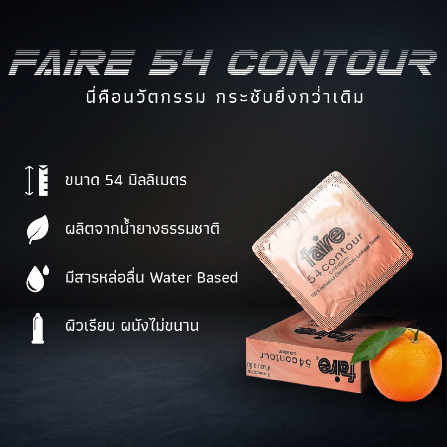 [12 กล่อง ราคาพิเศษ] แฟร์ 54คอนทัวร์ ถุงยางอนามัยผิวเรียบ 54มม กลิ่นส้ม12กล่อง รวม36ชิ้น