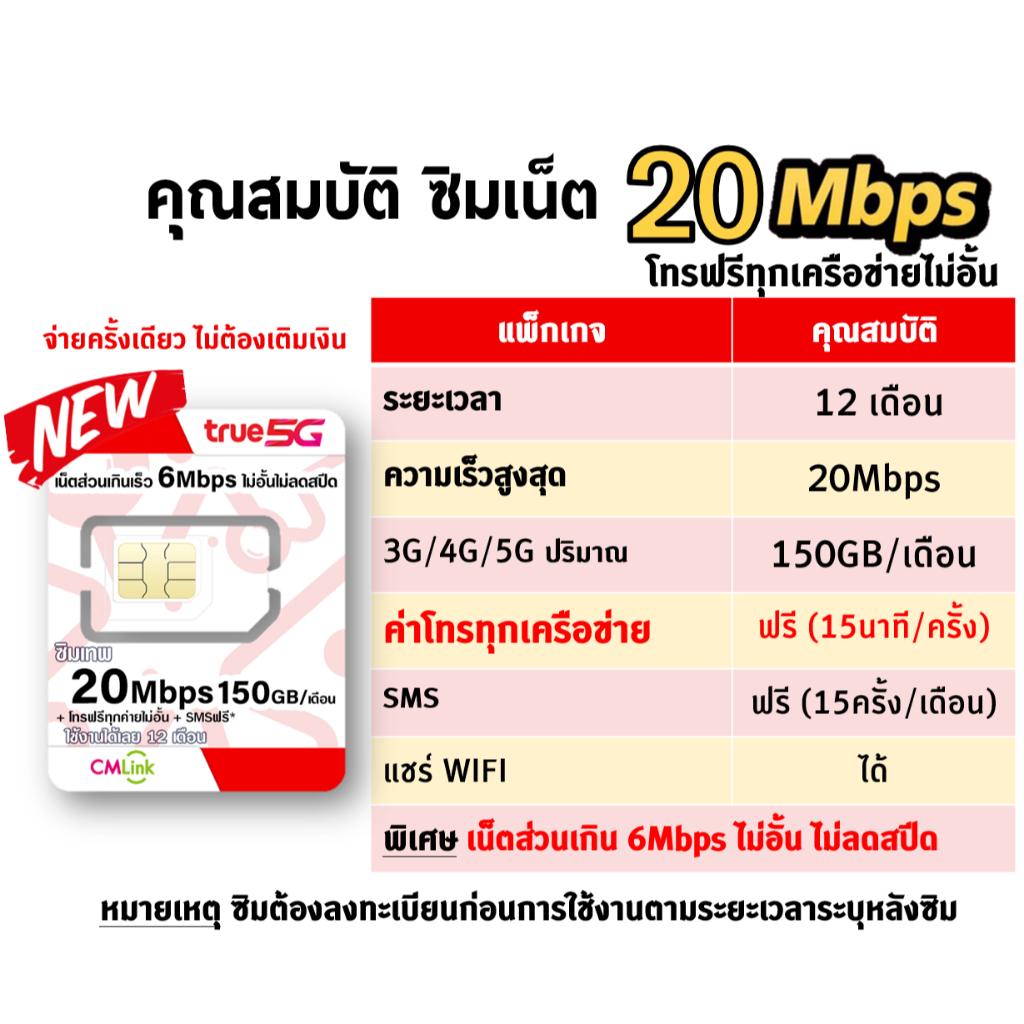 [ Liveแบบ 2 ] ซิมเทพ ทรู TRUE cmlink เน็ตรายปี 20Mbps , 30Mbps 150GB/เดือน ส่วนเกิน 6Mbps ไม่อั้น โทรฟรี* SMSฟรี*นาน 1ปี