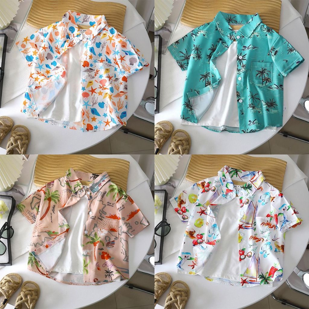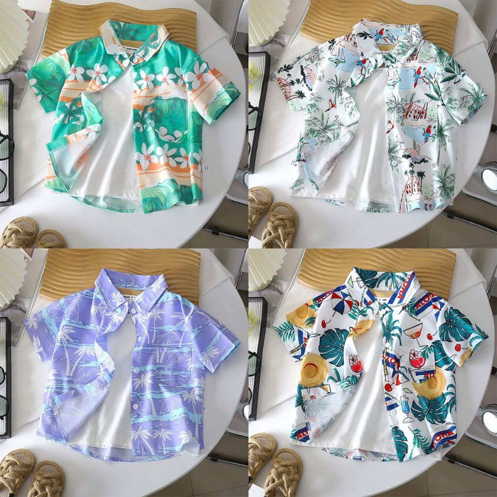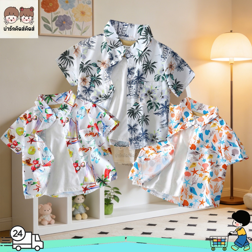 เสื้อเชิ้ตใส่เข้าวันสงกรานต์ เสื้อเชิ้ตแขนสั้นเด็ก สไตล์ทะเล ลายต้นไม้ ผ้านิ่มนุ่ม ไซส์90-150