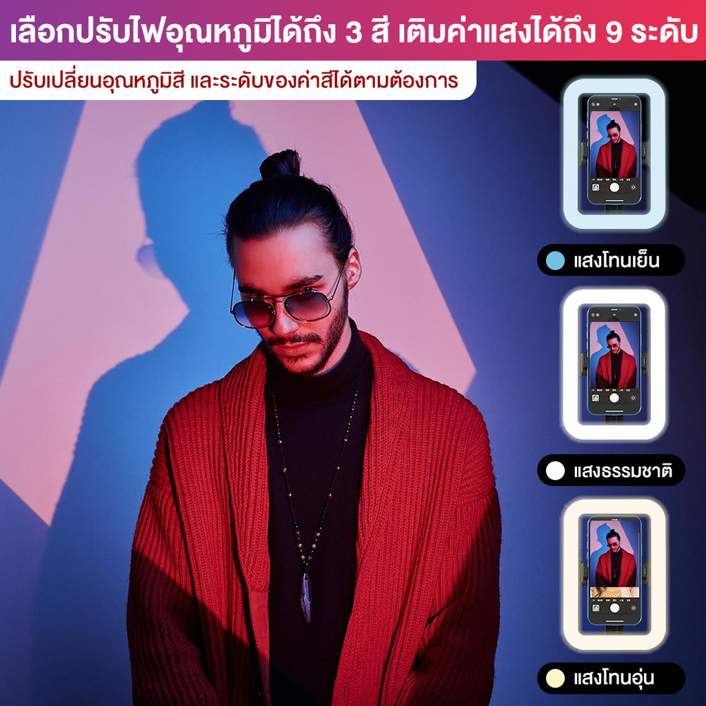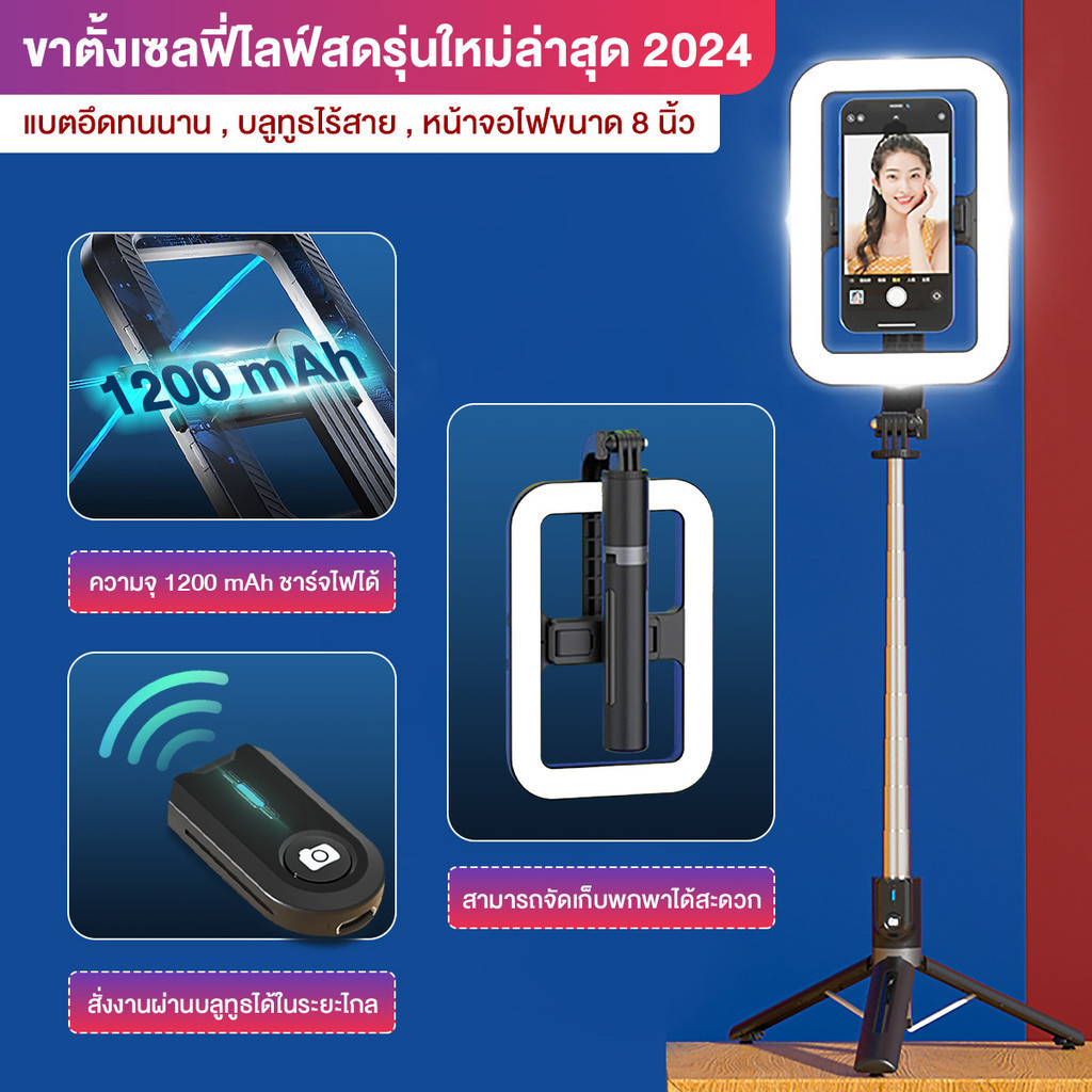 ไม้เซลฟี่ ขาตั้งกล้อง ไฟเซลฟี่ไร้สาย โหมดชาร์จ USB ไฟเติมแบตเตอรี่ความจุสูง ความสว่างปรับได้ 9 ระดับ