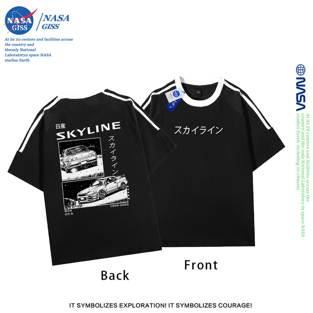 NASA เสื้อยืดสามแถบชายหญิง oversize แขนสั้น สไตล์ลำลอง summer ขอบฟ้า GTR พิมพ์ลาย คอตตอน100% คอกลม หลวมและระบายอากาศ