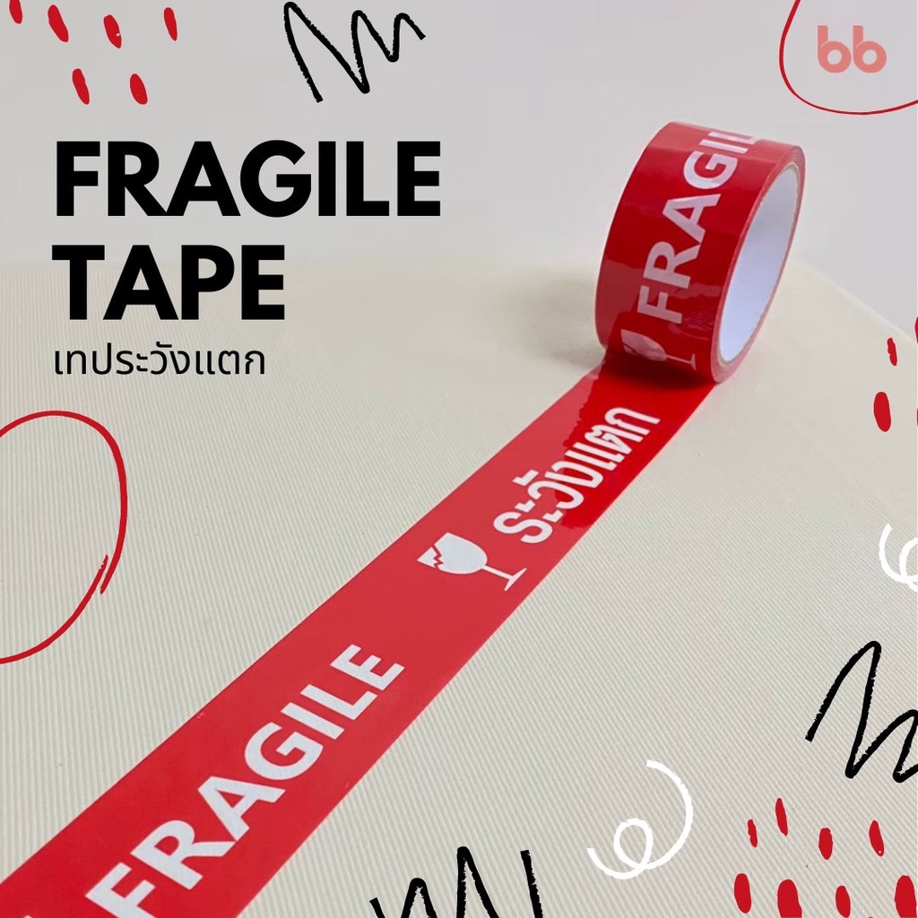 เทประวังแตก สีขาว/แดง/เหลือง/ดำ/ส้ม (ม้วน) 2 นิ้ว100 หลา 6 สี ระวังแตก fragile OPP tape ปิดกล่อง ติดกล่อง