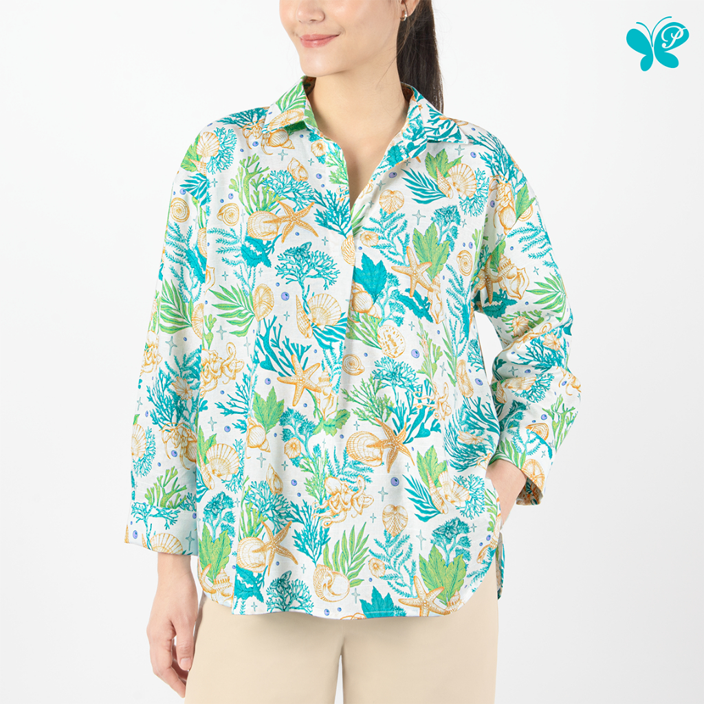 เสื้อเชิ้ตผู้หญิงทรงหลวม [Papillon] Women Oversized Shirt ผ้า Cotton Rayon Blend ใส่สบาย พิมพ์ลายทะเล (Ocean Reverie)
