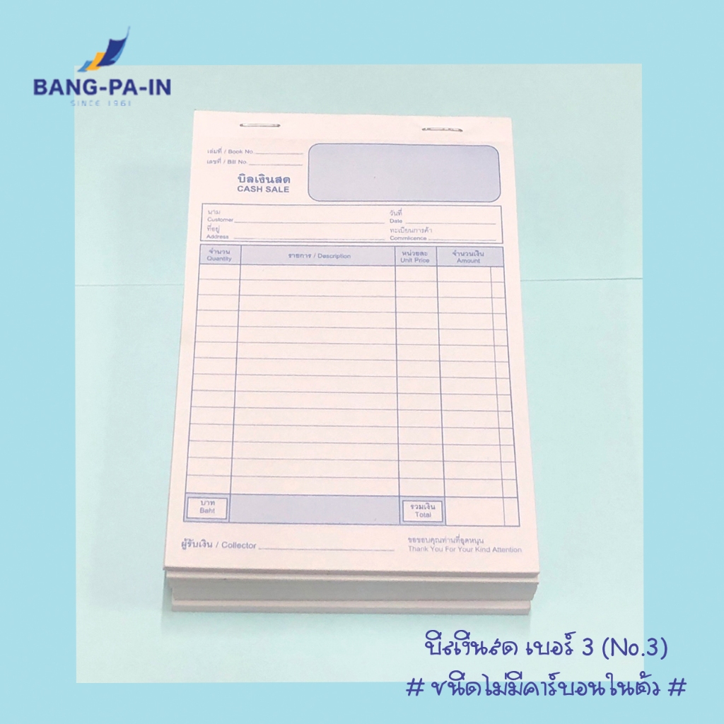 BANG PA IN บิลเงินสด เบอร์ 2 / เบอร์ 3 แบบไม่มีคาร์บอน (1 ชุด 2 แผ่น) ไม่มีปกหน้าหลัง เนื้่อใน 30 ชุด