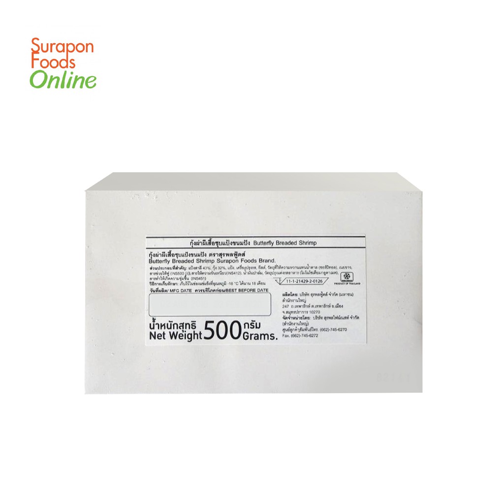 Suraponfoods กุ้งผ่าผีเสื้อ(Butterfly Breaded Shrimp) 500กรัม/กล่อง