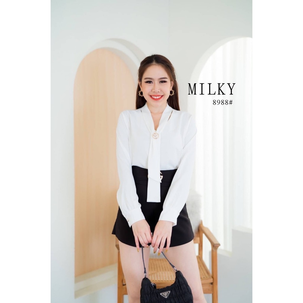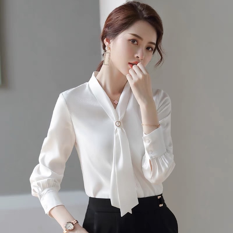 เสื้อทำงานผู้หญิง แขนยาว ออกแบบมีไข่มุกตรงคอเนื้อผ้าเกาหลี