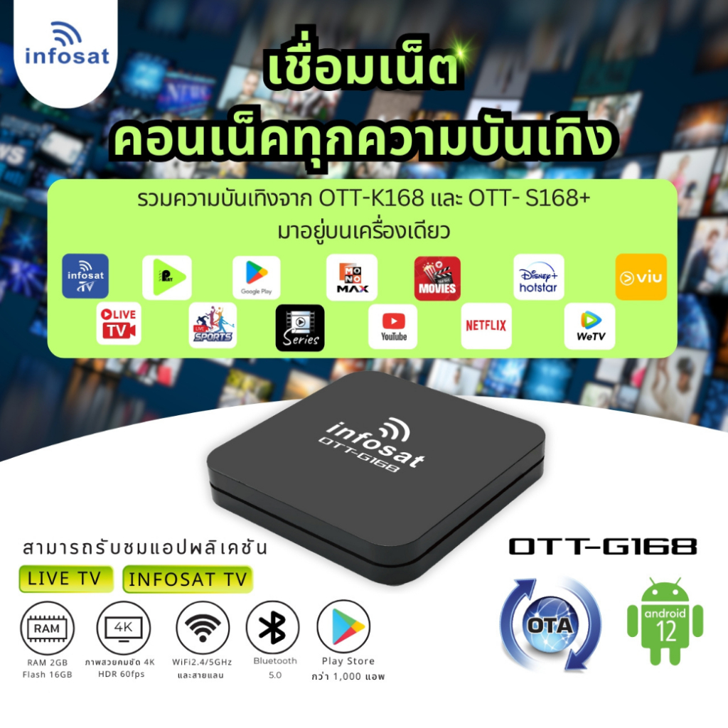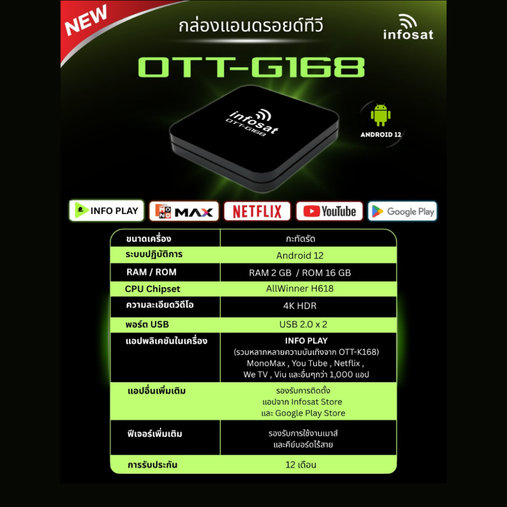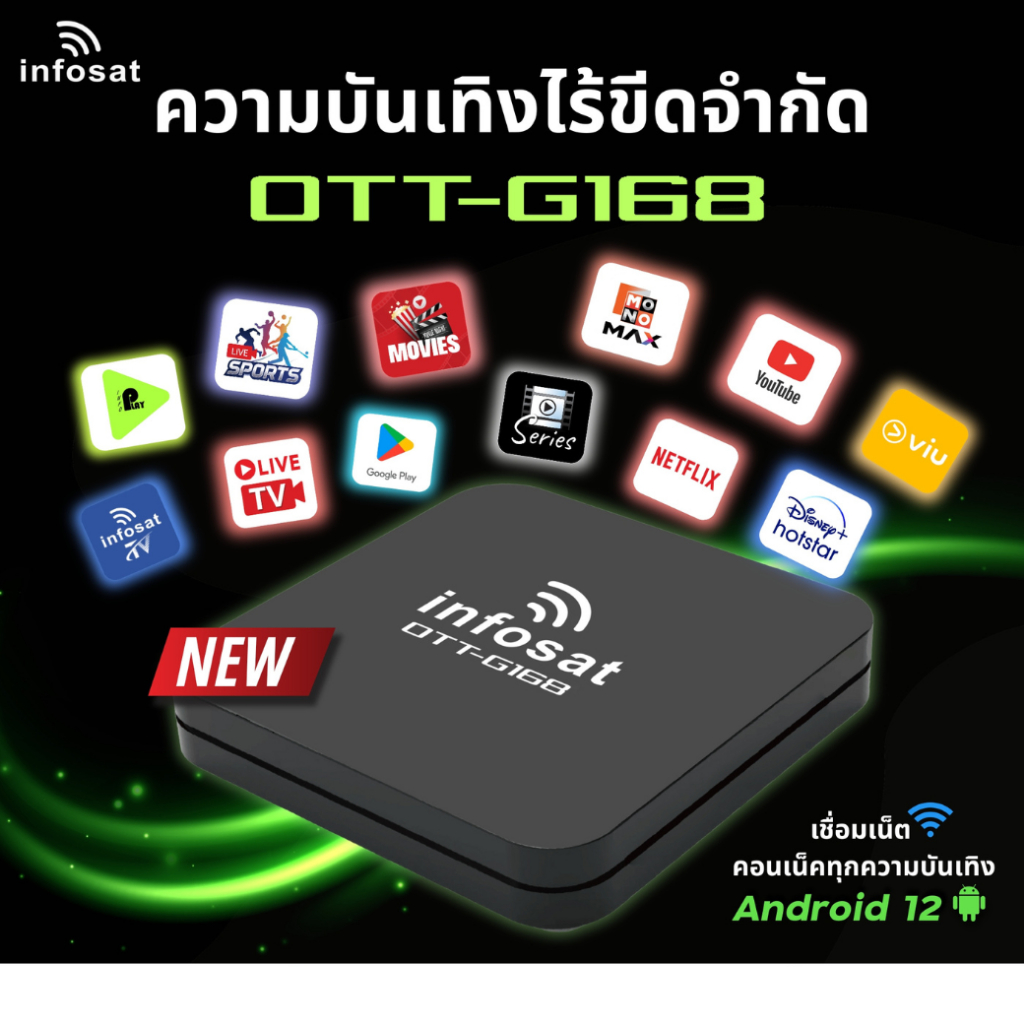 G168 (Android 12) กล่องทีวีอินเตอร์เน็ต (Infosat TV, Mono Max, Netflix, Ais Play) INFOSAT