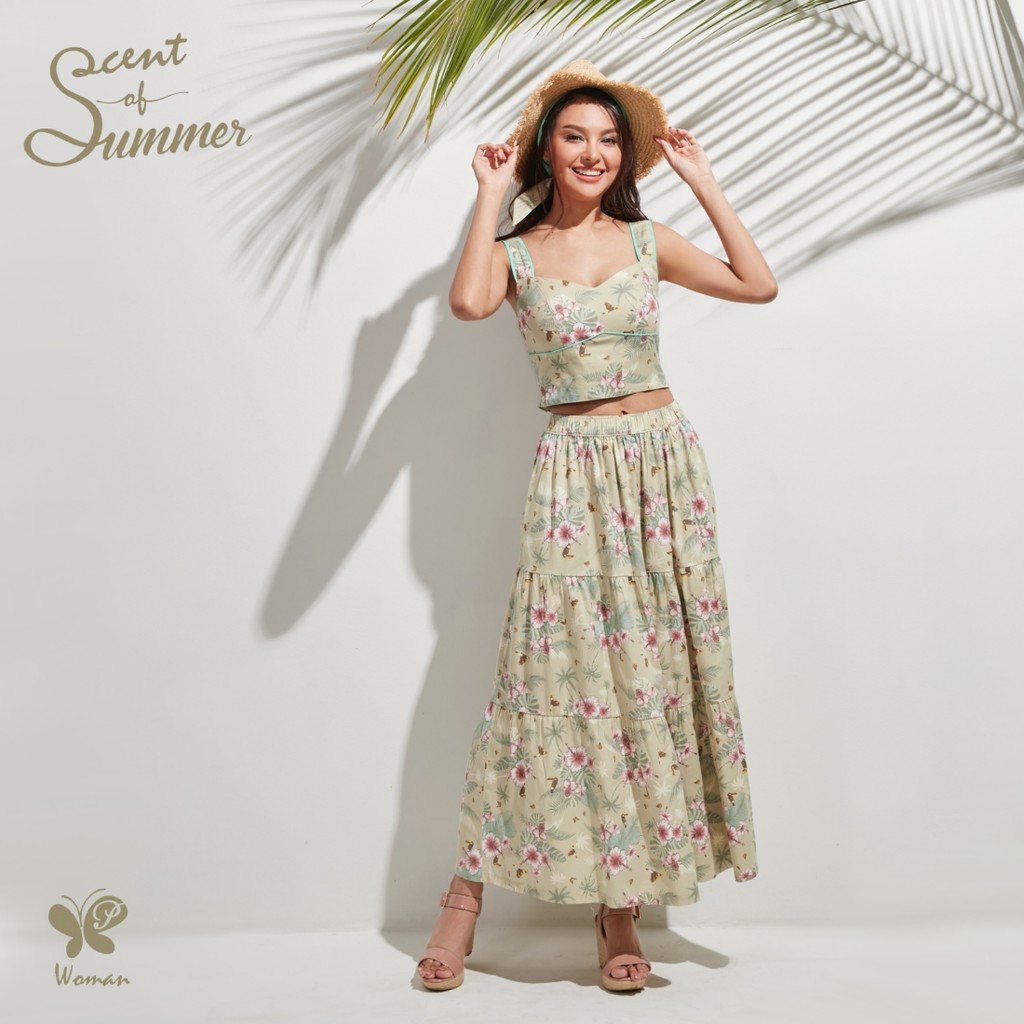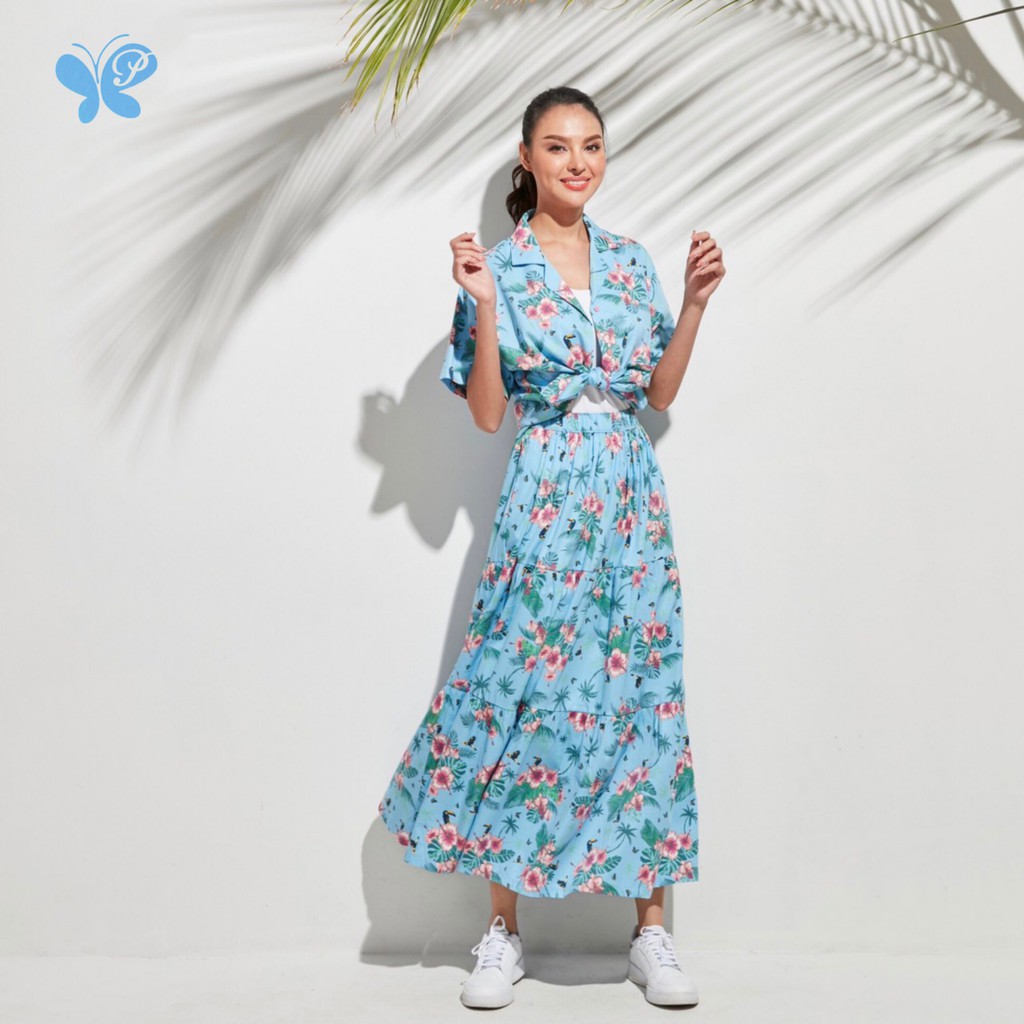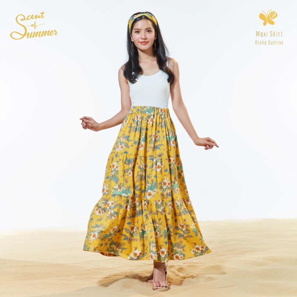 กระโปรงผู้หญิง [Papillon] Seabreeze Maxi Skirt เอวยางยืด มีกระเป๋า 2 ข้าง ลายดอกชบา ผ้า Cotton Rayon Twill ฝ้ายผสมเรยอน