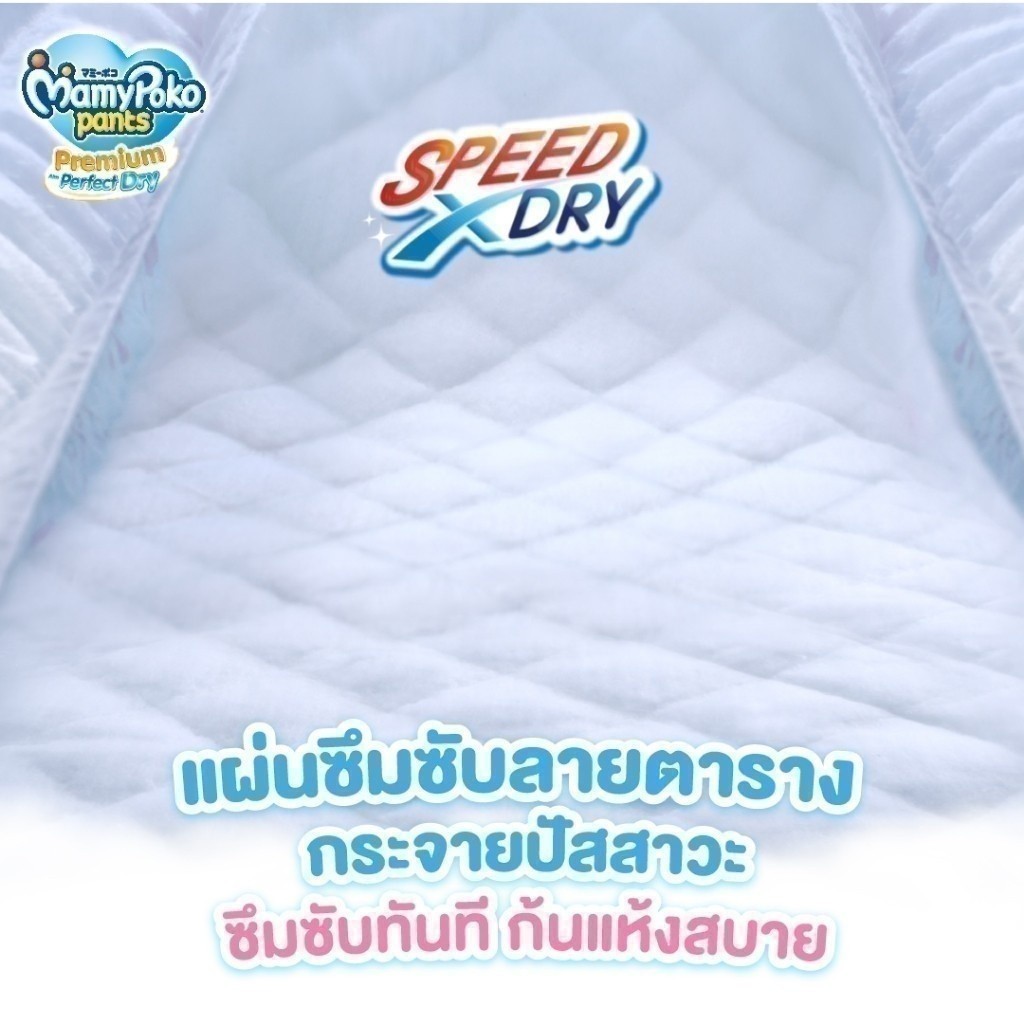 - ระบบ Speed X Dry ซึมซับรวดเร็วและแห้งสบายระดับพรีเมียมลดผดผื่นคัน