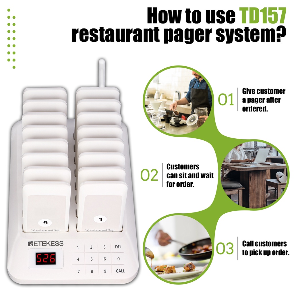 Retekess TD157 ระบบเรียกคิว เพจเจอร์เรียกคิว แบบไร้สาย ระบบเรียกคิว เครื่องเรียกคิวไร้สาย 1-99 ปุ่มกดระบบสัมผัส สำหรับร้านอาหาร 16 เครื่อง