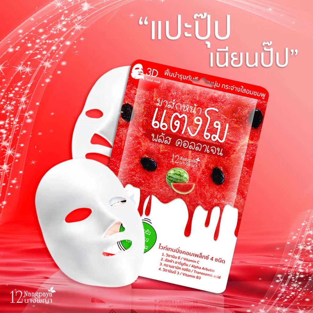 ผิวเนียนเด้ง ฉ่ำน้ำ มาส์กหน้า 3D แตงโม พลัสคอลลาเจน 12นางพญา (1 กล่อง / 10 ซอง)