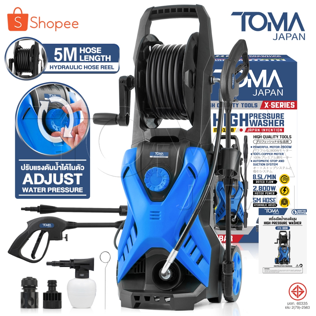 TOMA JAPAN เครื่องฉีดน้ำแรงดันสูง 180 บาร์ 2,600 วัตต์ รุ่นท๊อป TMW-180B เครื่องใหญ่ มอเตอร์ทรงพลัง ดูดน้ำได้ด้วยตัวเอง