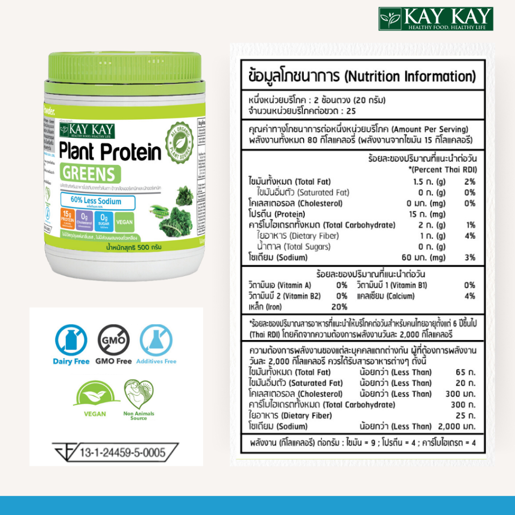 KAY KAY Organic Plant Protein Greens โปรตีนจากพืชออร์แกนิค สูตรกรีนส์ ผสมผักเคล ผักโขม วีแกน
