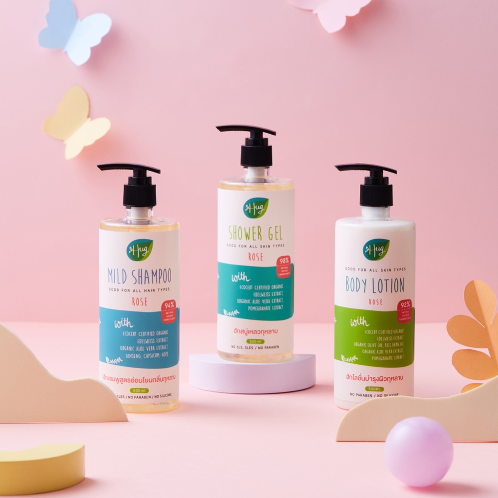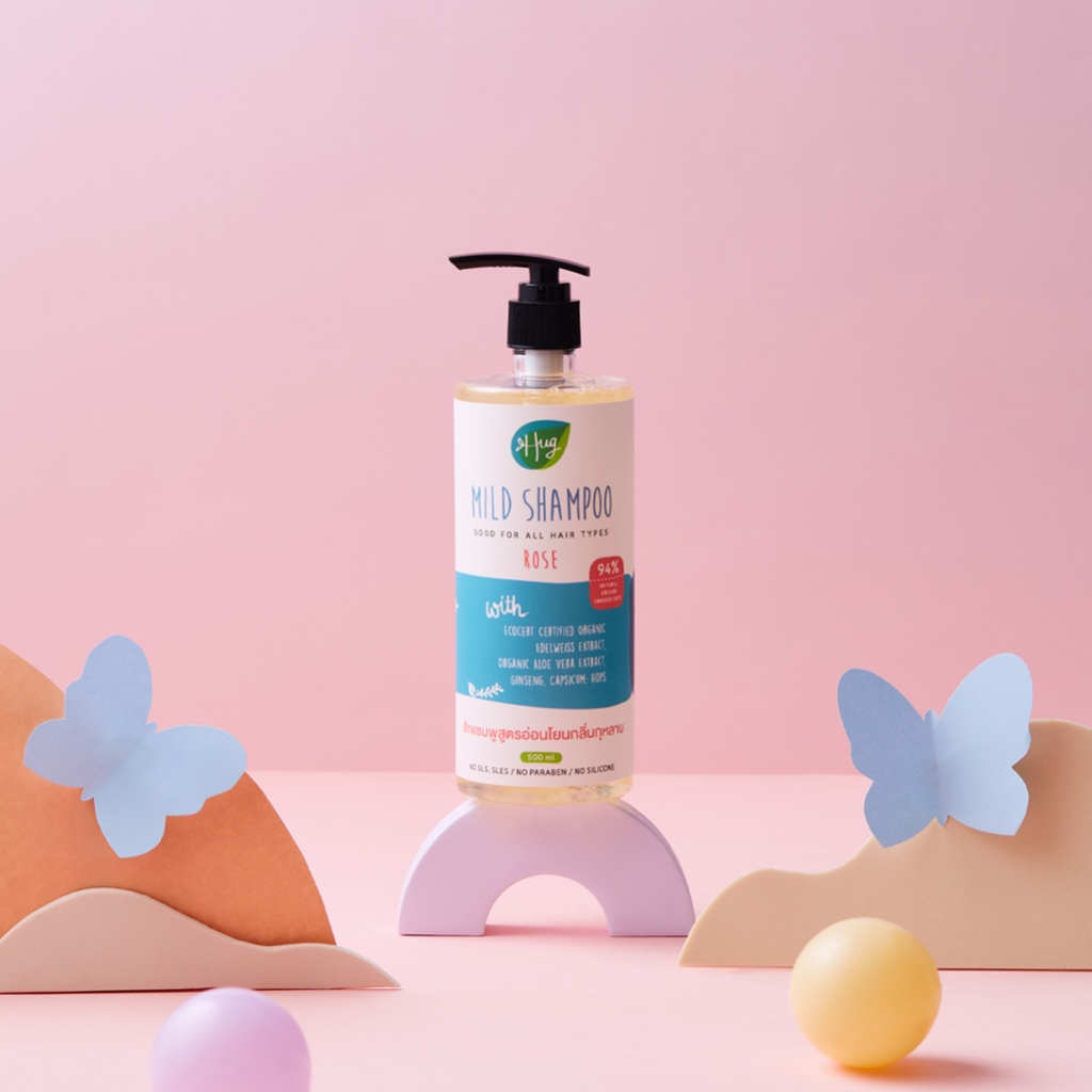 Hug แชมพู สูตรอ่อนโยน กุหลาบ ส่วนผสมจากธรรมชาติ 96% [Mild Shampoo Rose with 96% Natural Ingredients] - 500 ML