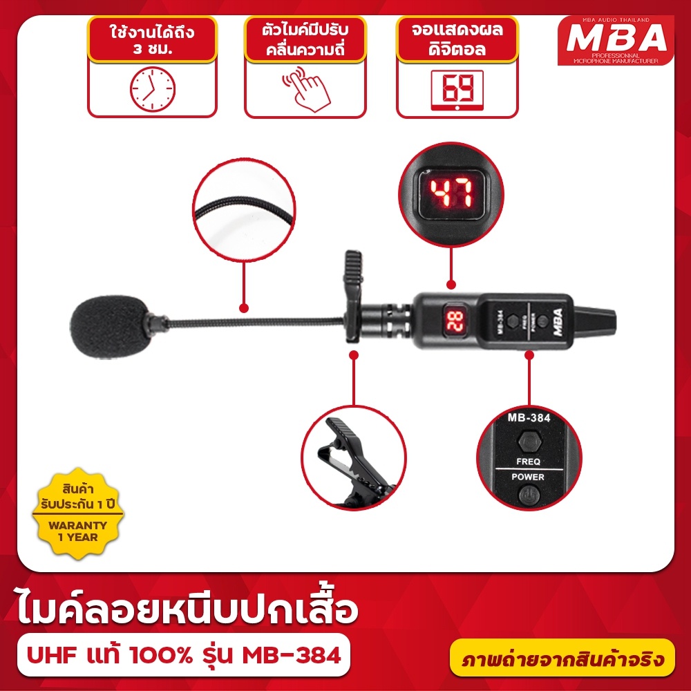MBAAUDIOTHAILAND ไมค์ลอยหนีบปกเสื้อ MBA รุ่น MB-384 คลื่นUHFแท้ ระยะรับส่ง 50เมตร ไมค์ 4ตัวใช้พร้อมกัน ไมค์ลอย ไมโครโฟน