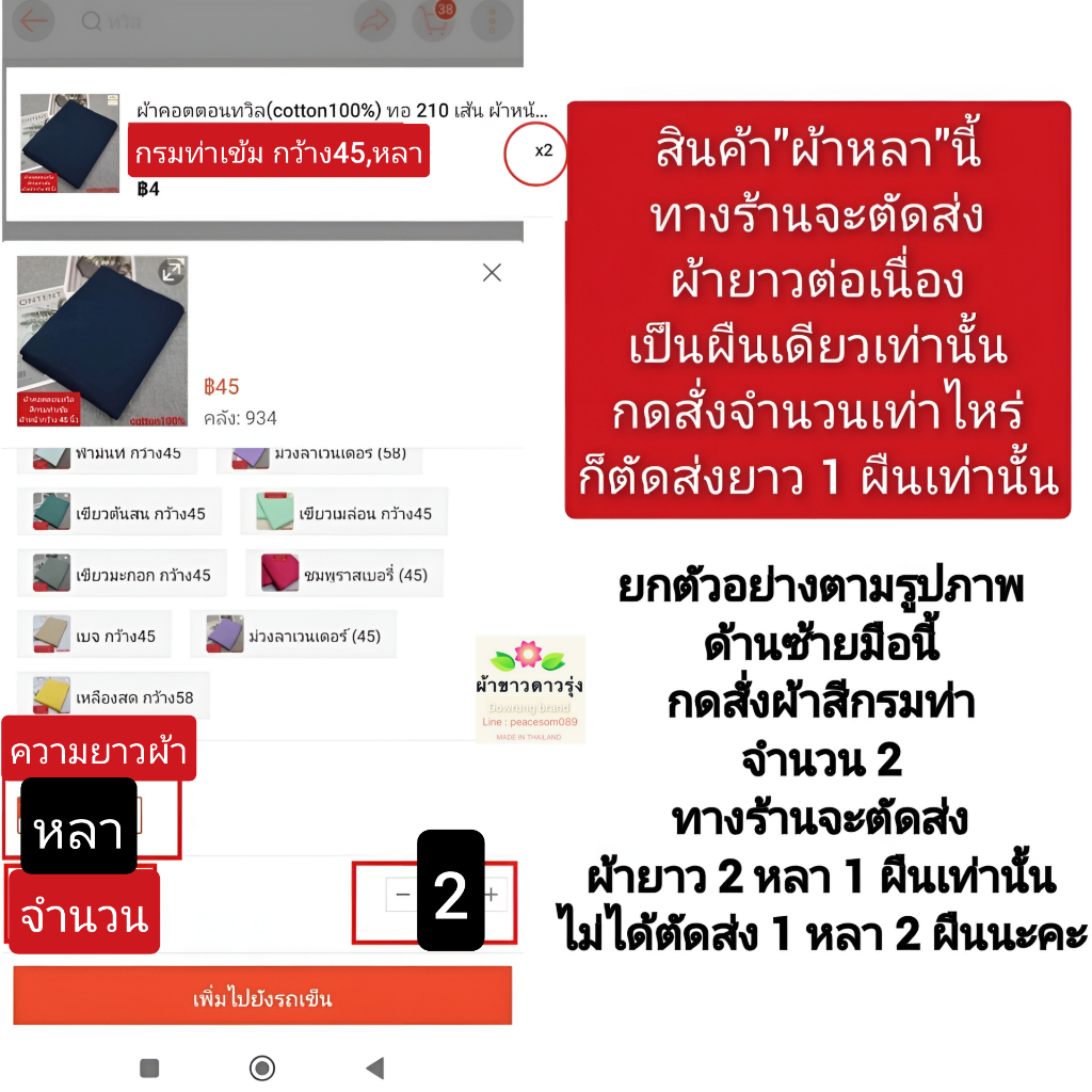 ผ้าคอตตอนทวิล ทอ 210 เส้น ผ้าหน้ากว้าง 45 นิ้ว-60 นิ้ว ราคาหลาละ 40-55 บาท ใช้ตัดเสื้อ ไม่ยืด ผ้านิ่ม สีไม่ตก