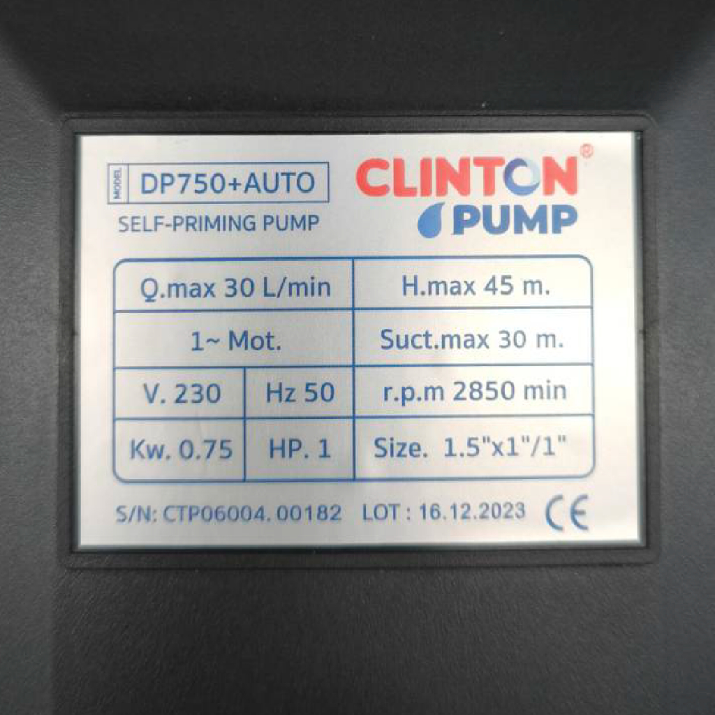 ปั๊มเจ็ท ท่อคู่ระบบออโต้ 1 แรงม้า 750W ดูดลึก 30 เมตร ปั๊มน้ำ ใบพัดทองเหลืองแท้ CLINTON รุ่น DP750W